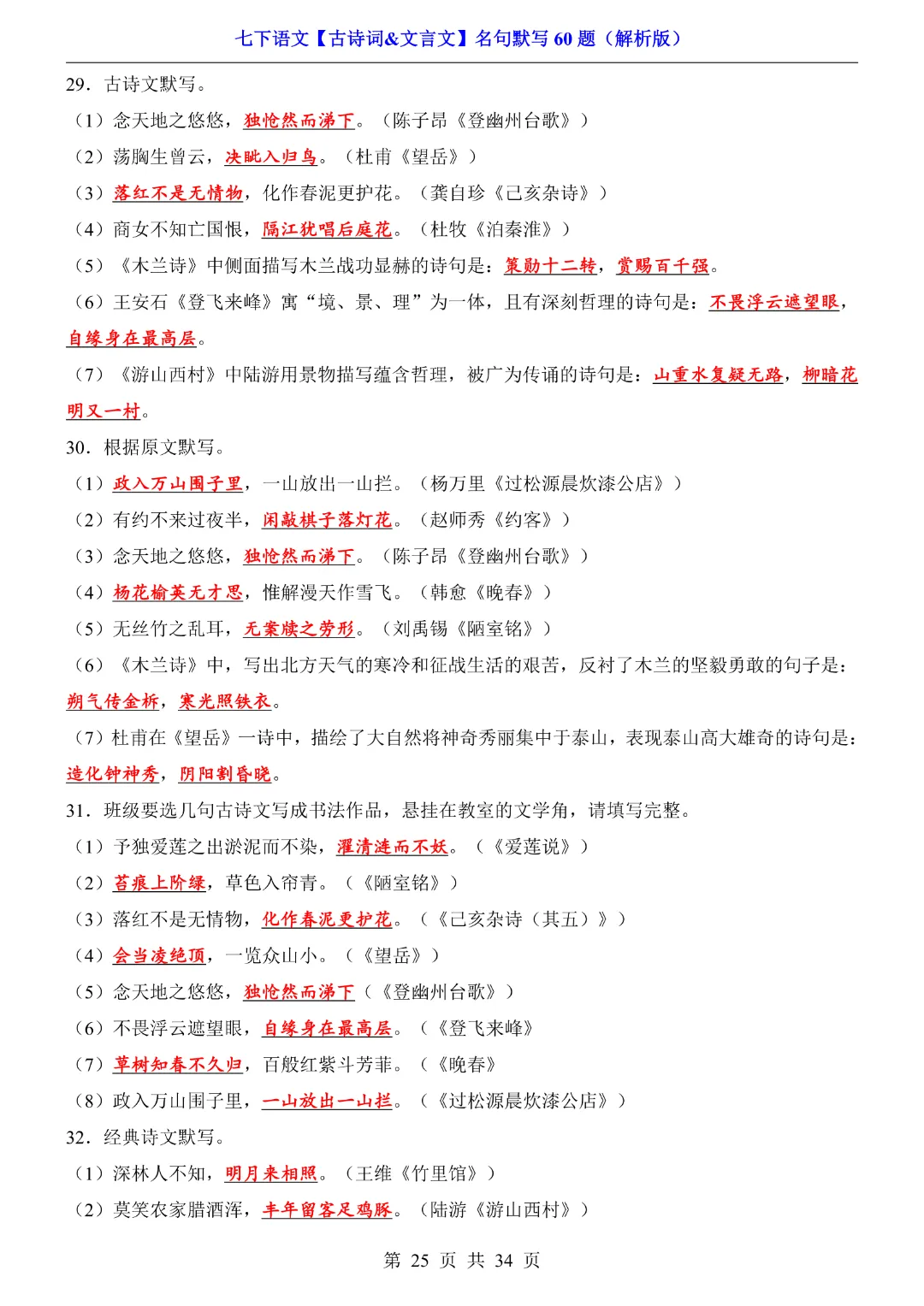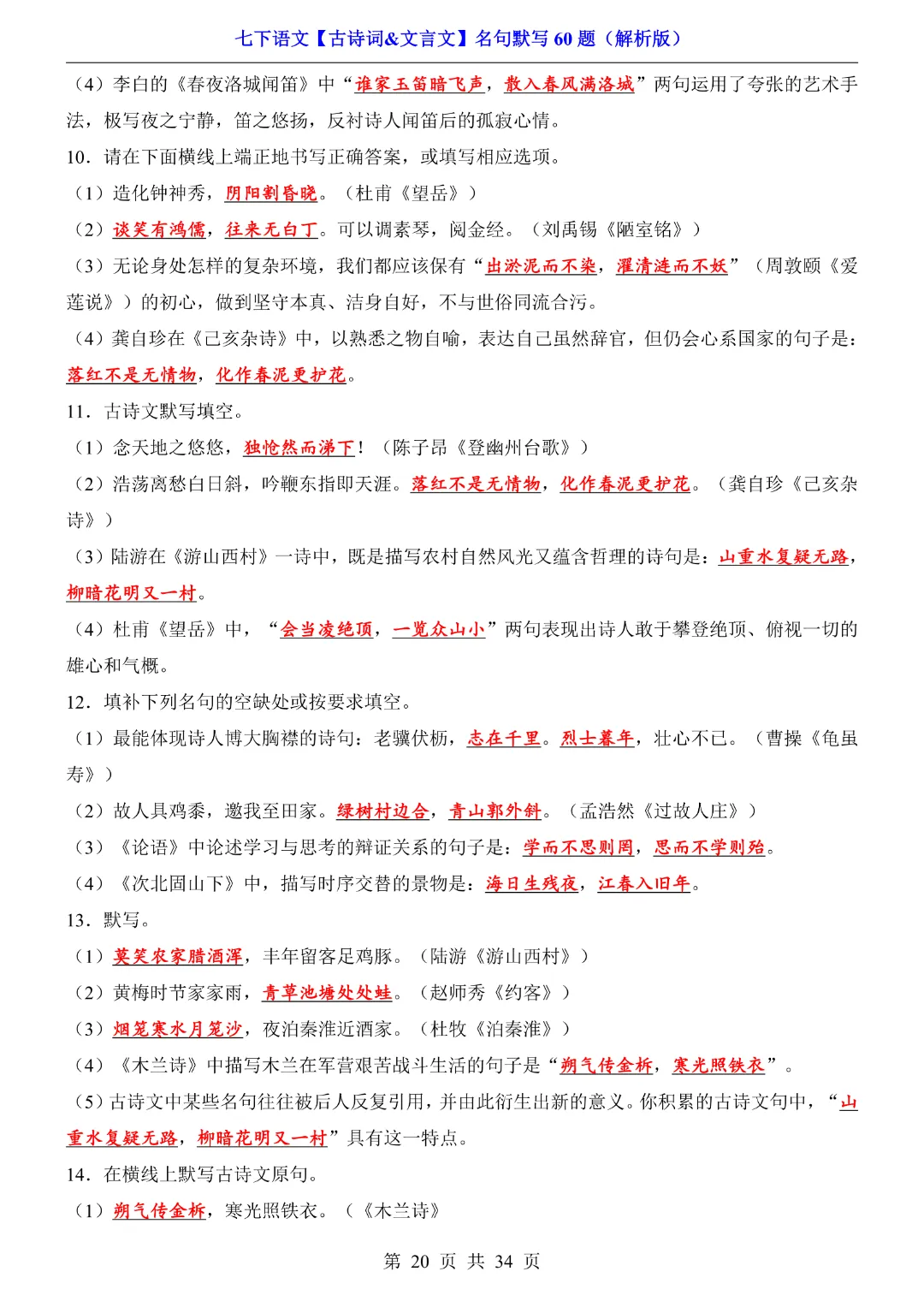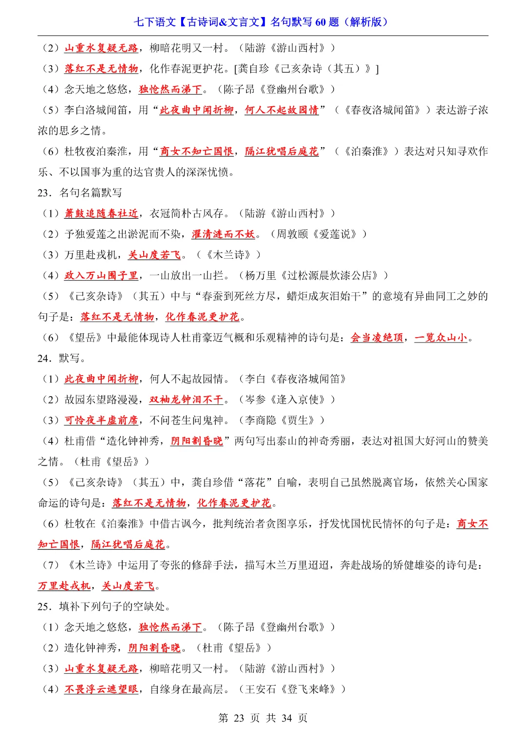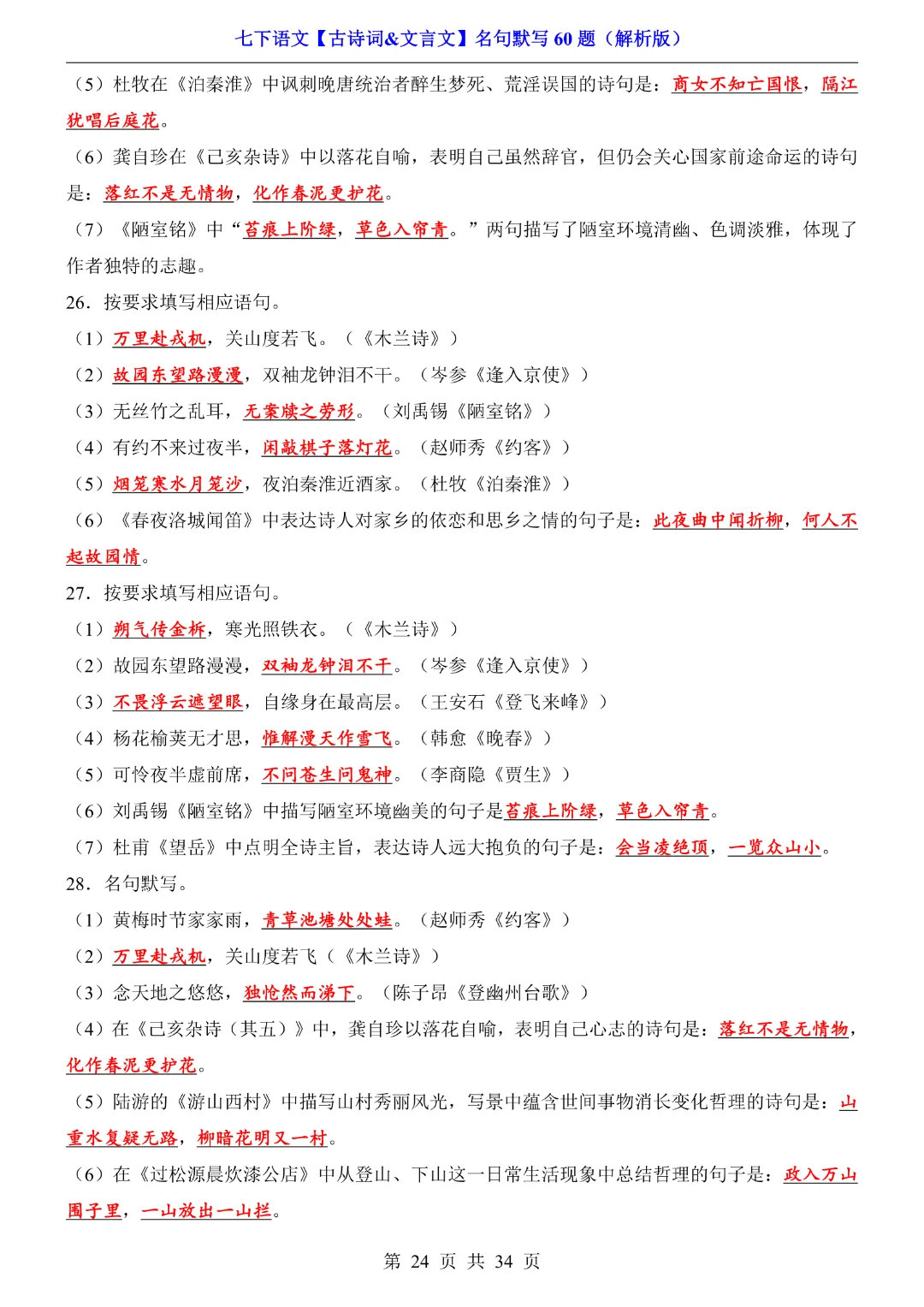 【七年级下册语文】【人教部编版】古诗词文言文名句默写训练60题|完整高清可打印
