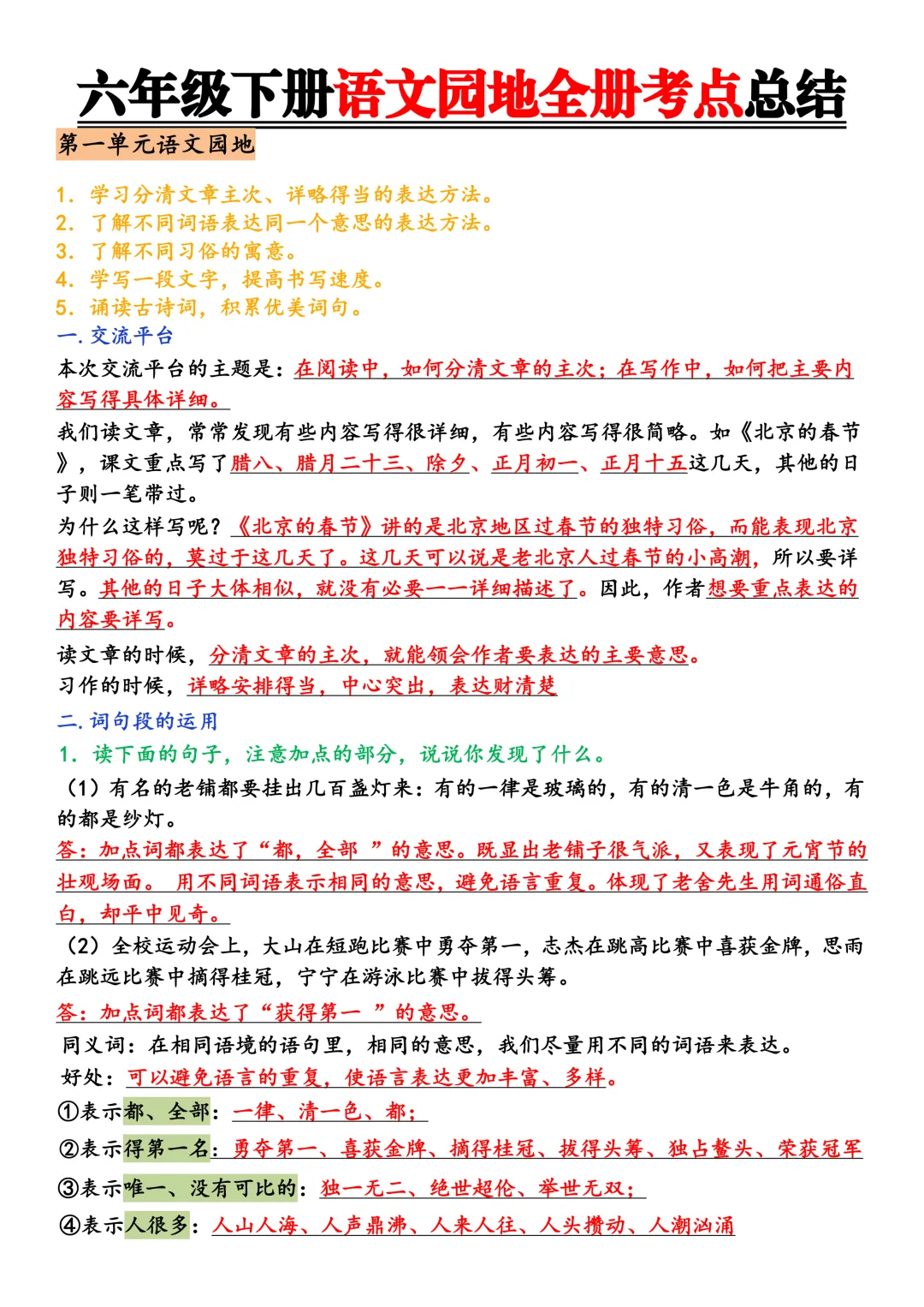 今天为大家分享:语文学习的魅力,在于将内心的情感与思考,转化为能触动人心的文字。而六年级下册的语文园地,正是这样一座宝藏库,它不仅梳理了全册的核心考点,更教会我们如何让表达更精准、更生动、更有感染力。从分清文章主次的详略之法,到借物言志的抒情之道,再到用夸张修辞放大情感的技巧,每一个知识点都像一把钥匙,帮我们打开了通往优质表达的大门。