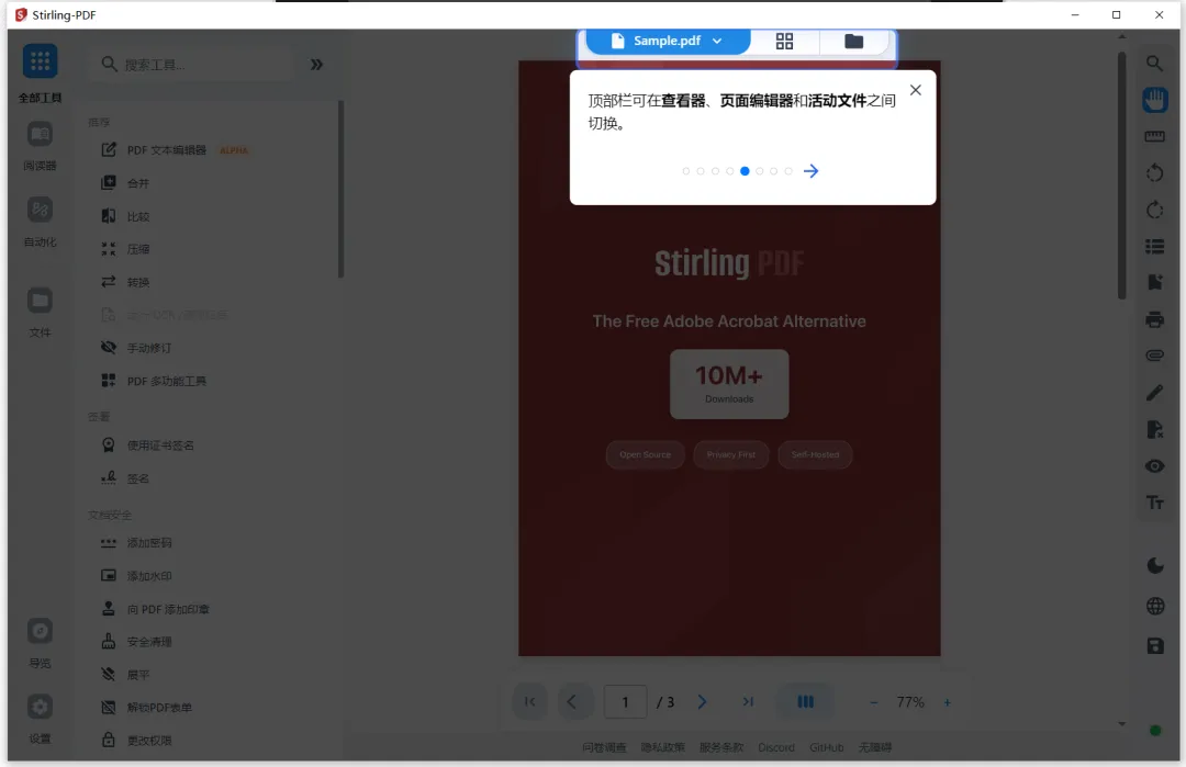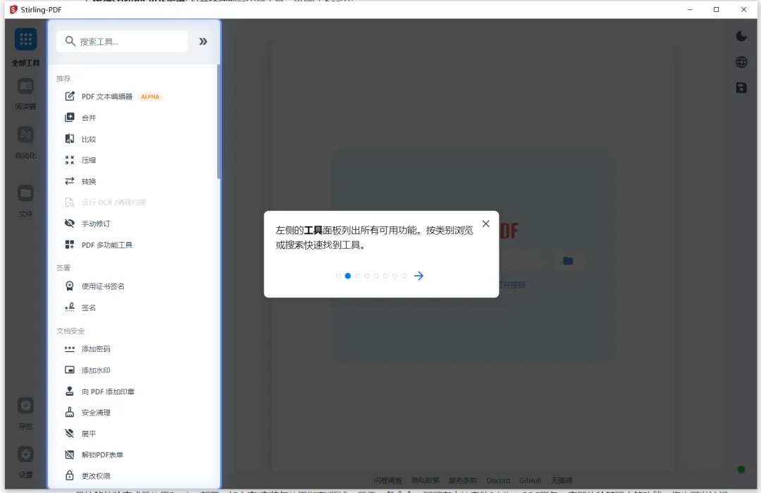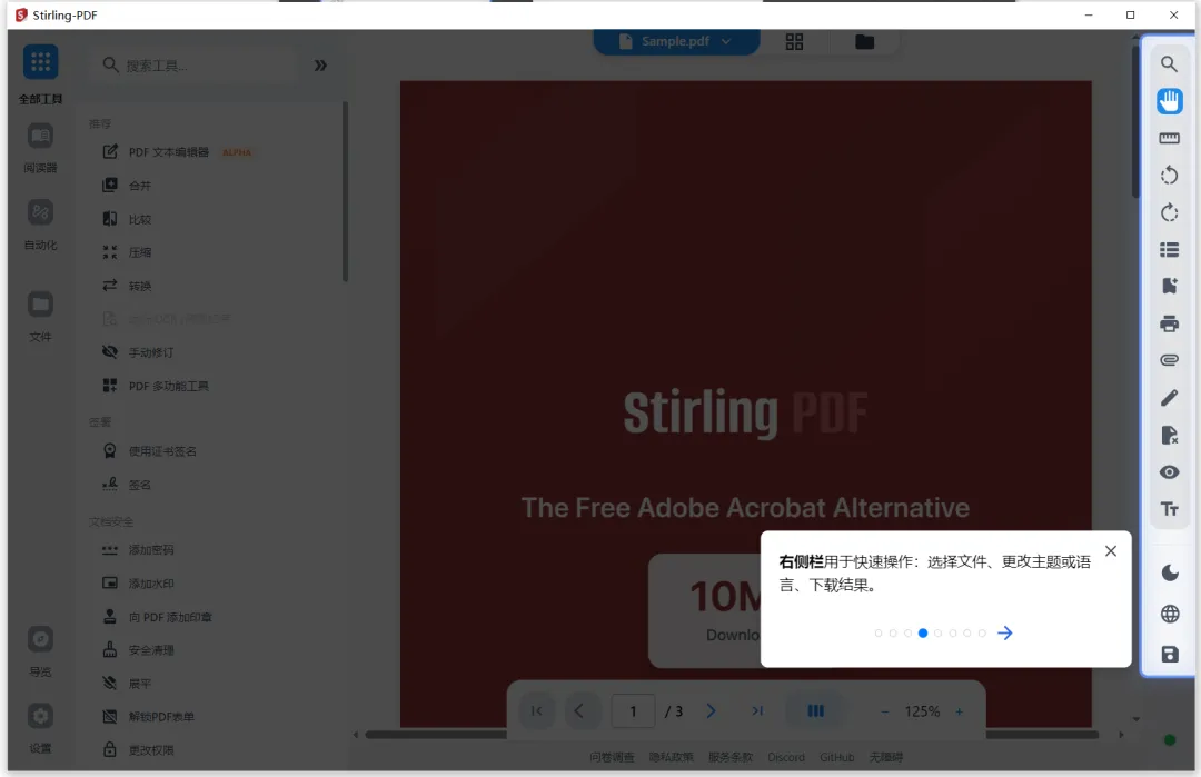 跨平台支持: 无论是Windows、macOS、Linux,还是通过Docker部署在服务器上,Stirling-PDF都能稳定运行。