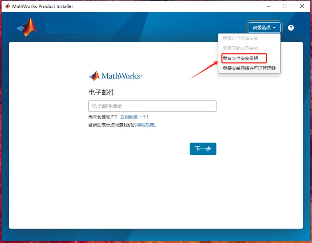 第五步:右上方点【高级选项】,然后选择【我有文件安装密钥】。(有的电脑可能不出此步骤)