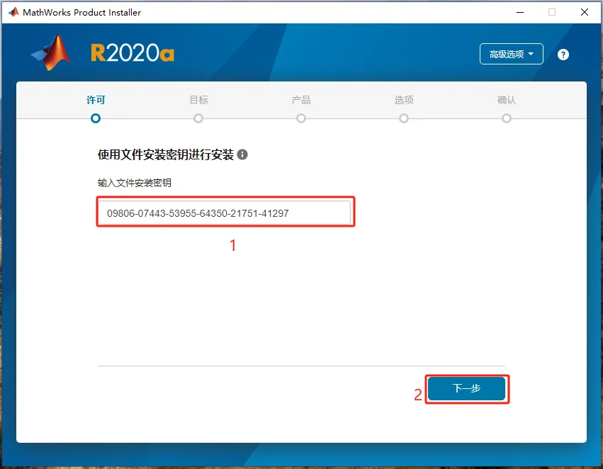 第七步:复制以下标红秘钥并粘贴输入【09806-07443-53955-64350-21751-41297】,点击【下一步】。