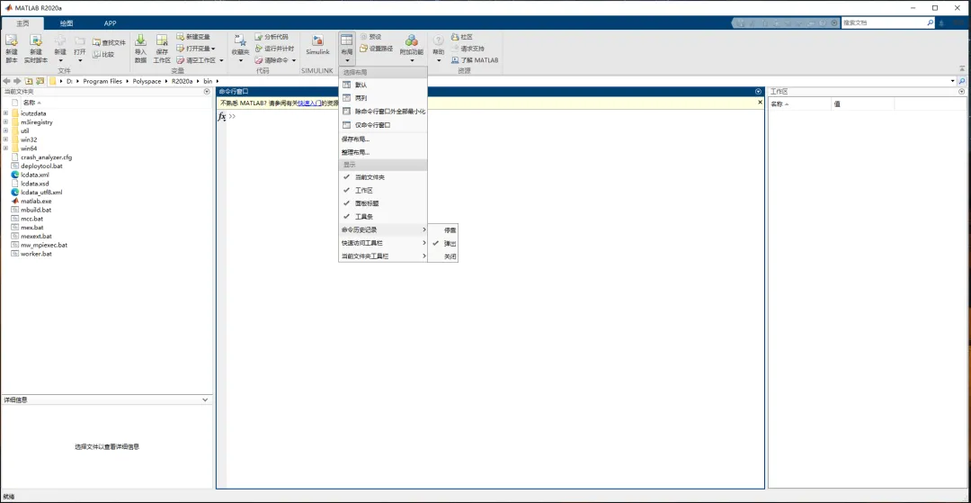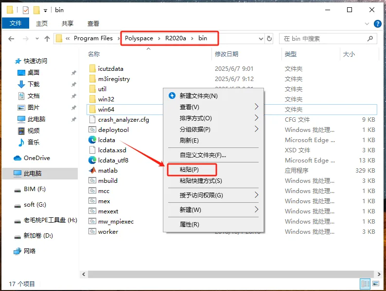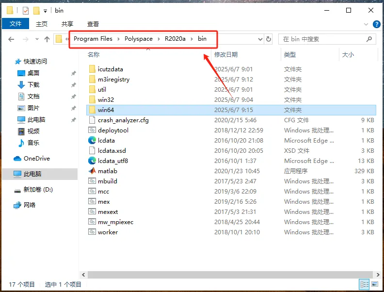 第十九步:手动打开软件安装目录,并依次打开【D:\Program Files\Polyspace\R2020a\bin】。(注:显示的信息要与下图一致。)