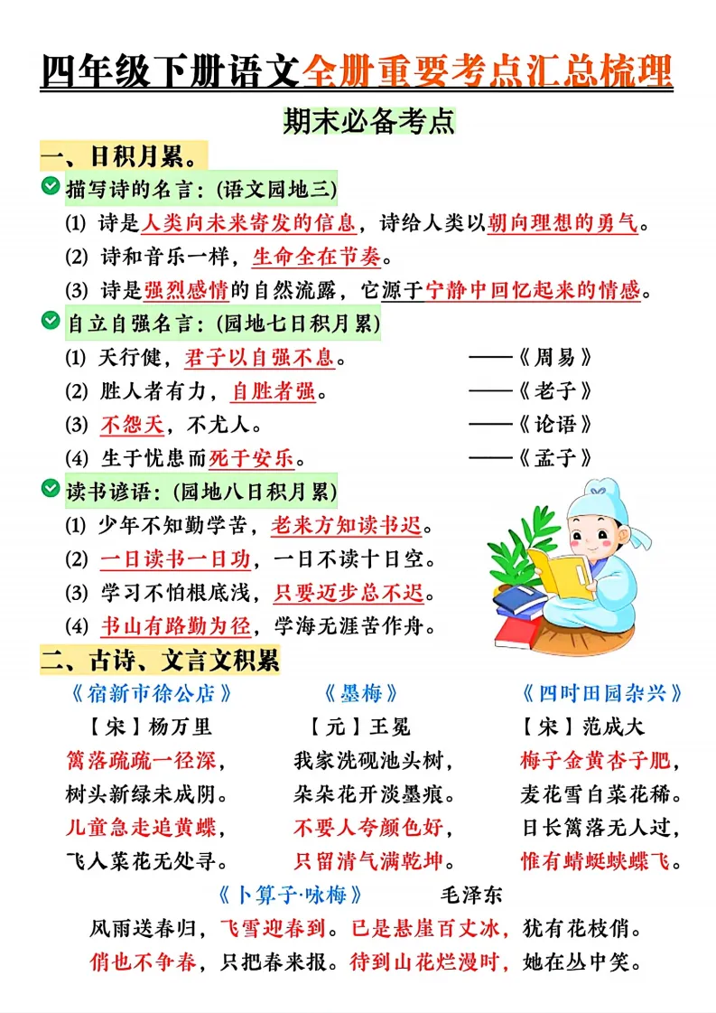 四年级孩子语文考点零散,古诗、文言文、作文没思路?这份考点汇总太实用!涵盖日积月累、重点词语、课文主题和写作技巧,解析清晰。孩子系统复习,家长不用费心整理,轻松应对考试~