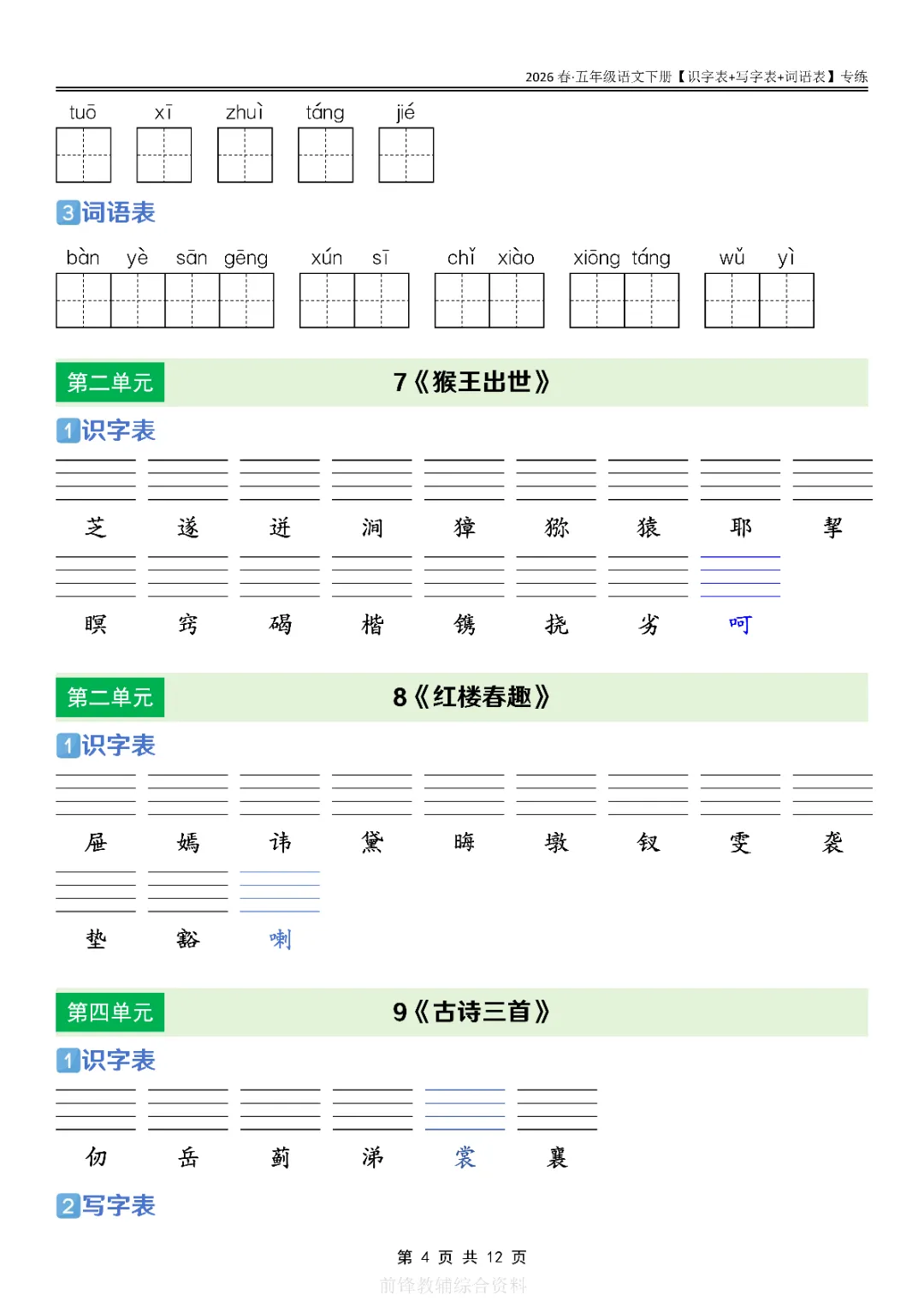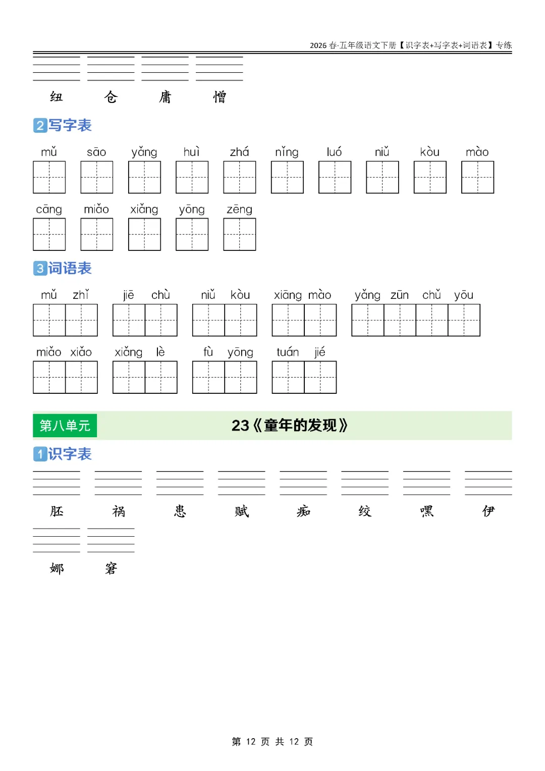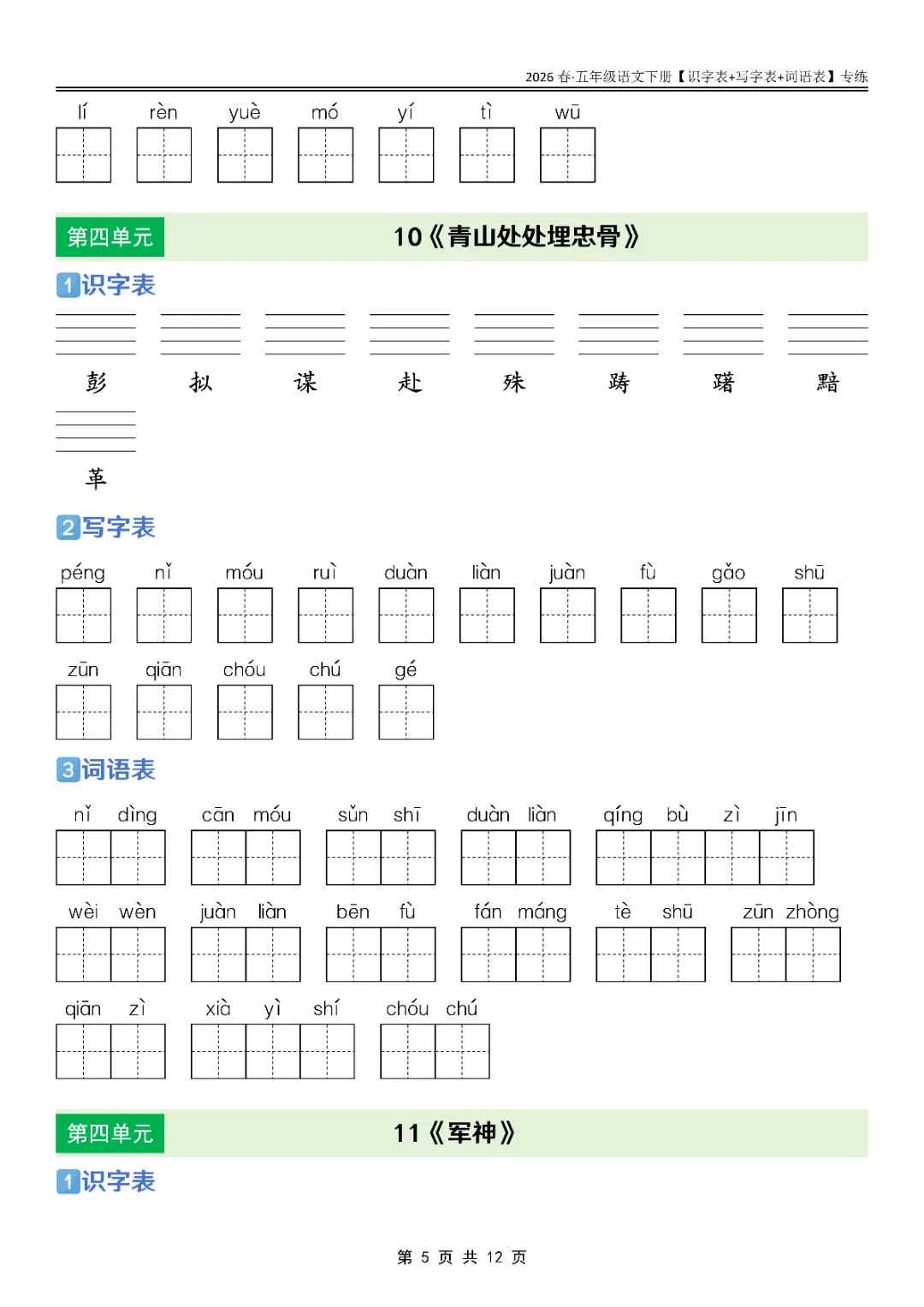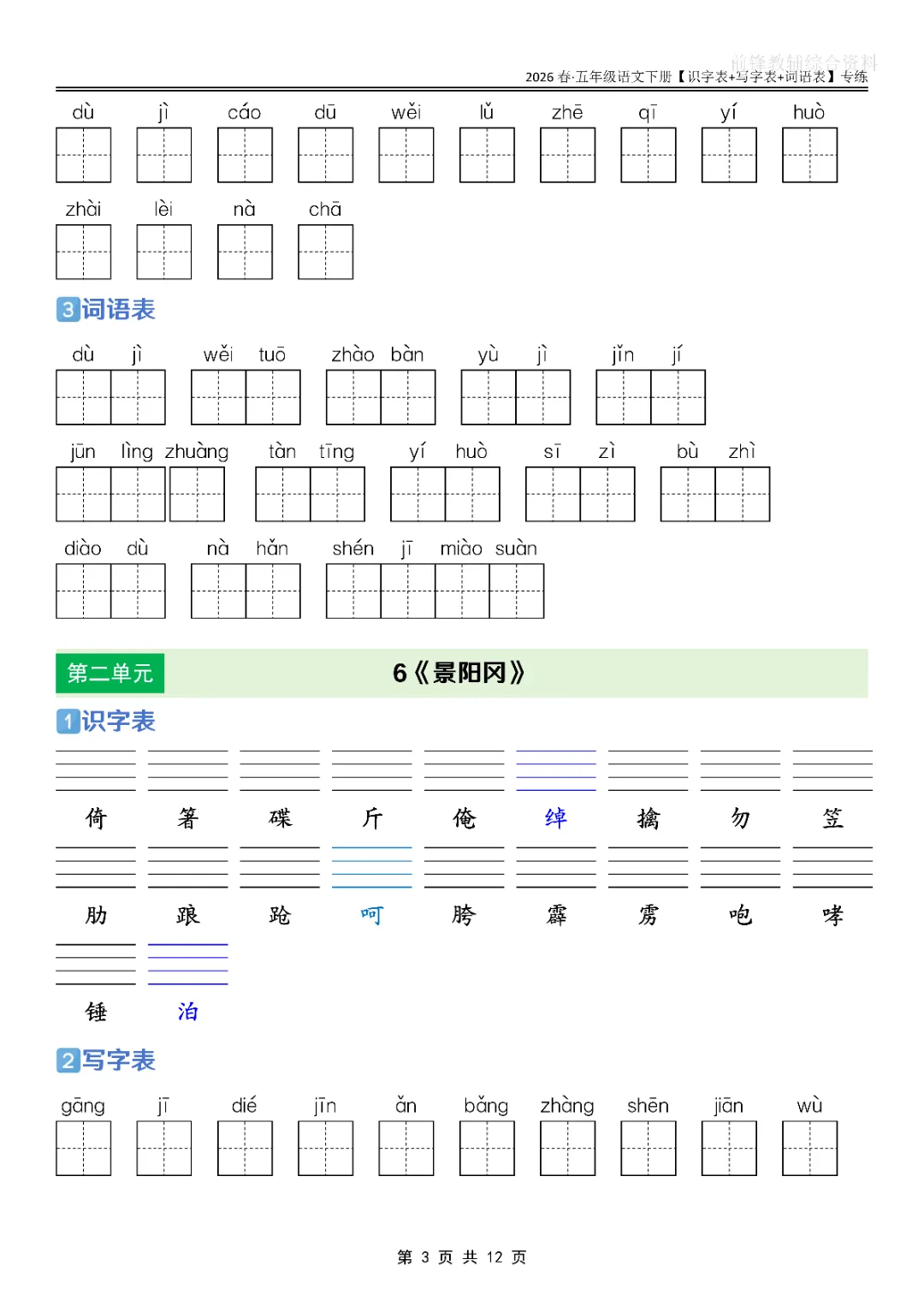 点击蓝字,关注我们 2026年五年级下册语文课后三表专练|电子版可打印