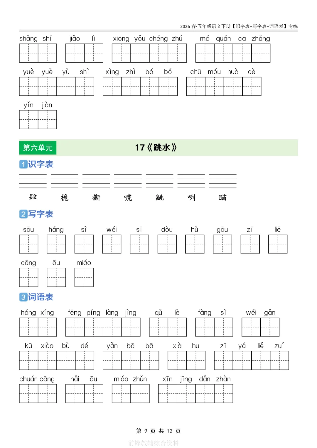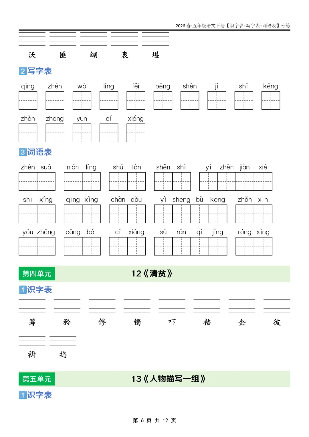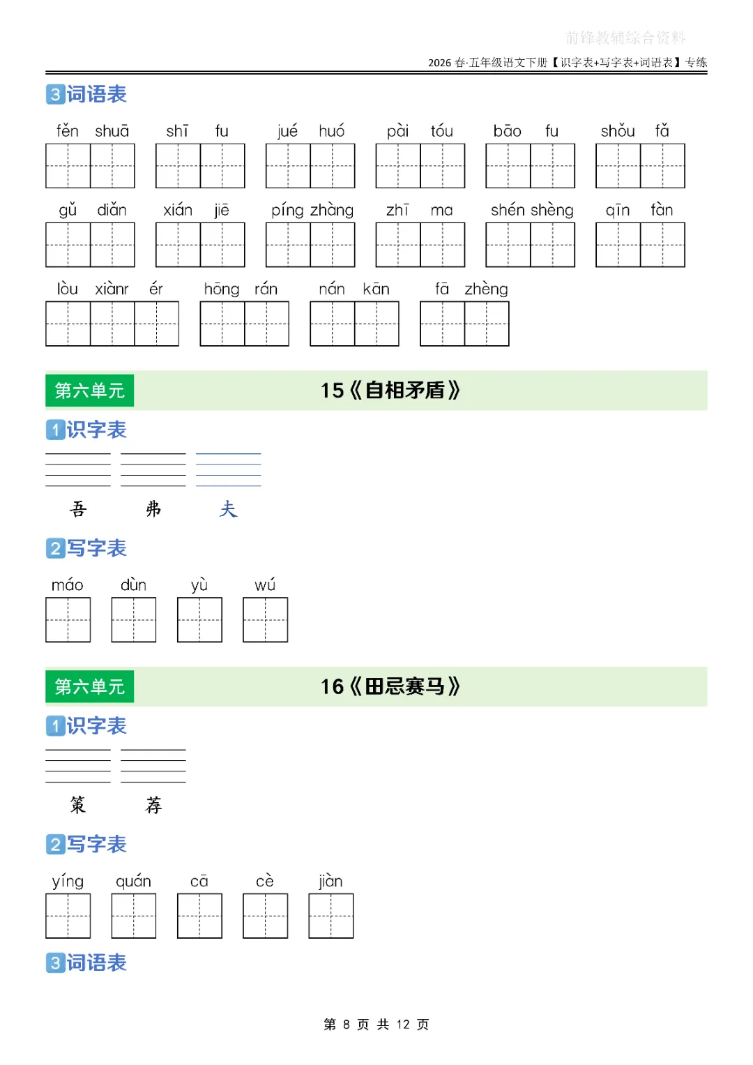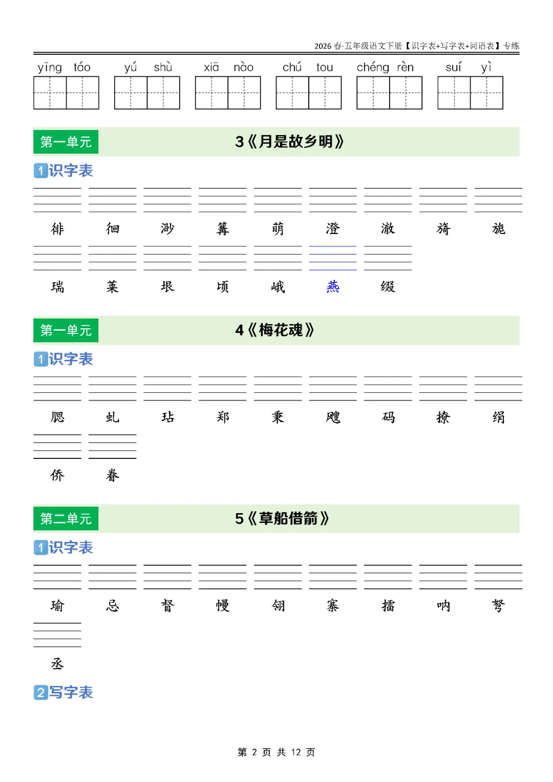 点击蓝字,关注我们 2026年五年级下册语文课后三表专练|电子版可打印