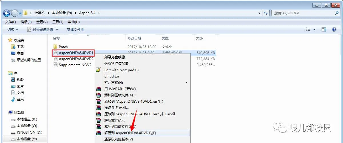 1.打开下载好的“Aspen 8.4”文件夹,鼠标右击软件压缩包“AspenONEV8.4DVD1”,选择“解压到AspenONEV8.4DVD1”