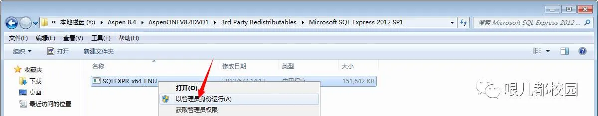 3.打开“Aspen 8.4\AspenONEV8.4DVD1\3rd Party Redistributables\Microsoft SQL Express 2012 SP1”文件夹,鼠标右击“SQLEXPR_x64_ENU”,(这个是64位的,32位的自己去找一下)选择“以管理员身份运行”(可参考本公众号SQL 2012)