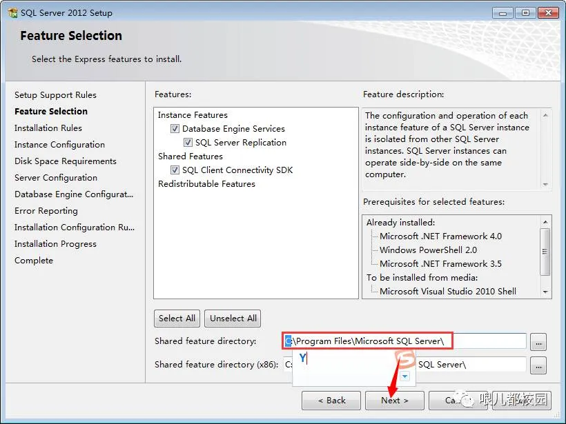 8.功能选择:建议把SQL软件安装到除C盘以外的磁盘,我这里直接将C改为Y,安装到Y盘(安装目录自己定义,但是两个目录千万不要放在不同的盘符!),选择好安装路径,然后点击“Next”
