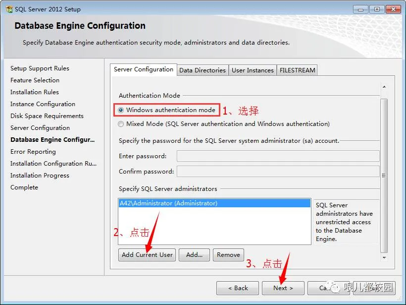 11.数据库引擎配置:选择“Windows authentication mode”;然后添加一个管理员(个人电脑的话直接添加当前用户,公用的话自行设置),点击“Add Current User”;最后点击“Next”