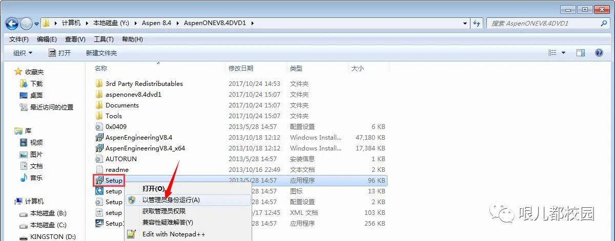 20.打开“Aspen 8.4\AspenONEV8.4DVD1”文件夹,鼠标右击“Setup”,选择“以管理员身份运行”