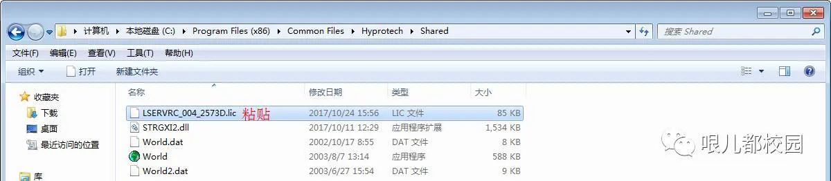 38.找到目录(默认为:C:\Program Files (x86)\Common Files\Hyprotech\Shared)进入该文件夹,粘贴刚刚复制的“LSERVRC_004_2573D.lic”文件