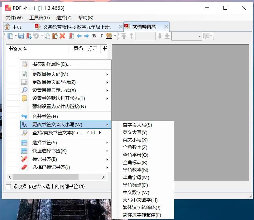 更改书签文本大小写:首字母大写、英文大写、英文小写、全角数字、全角字母