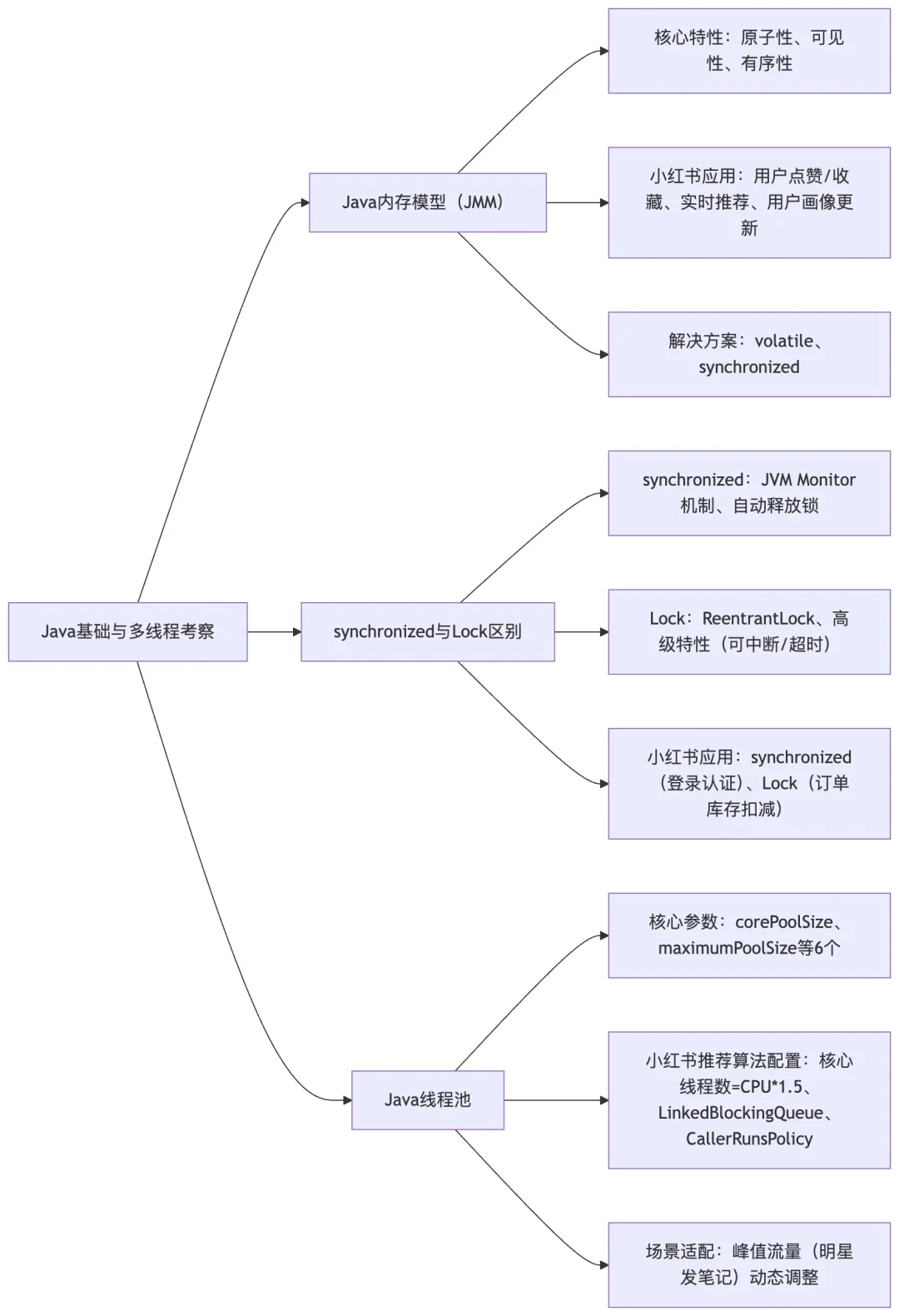 核心说明:梳理Java基础与多线程核心考点,关联小红书高并发、推荐算法等业务场景,明确考点与业务的对应关系,体现”技术落地业务”的面试考察重点。
