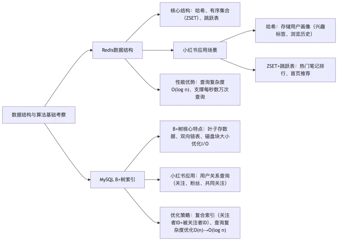 核心说明:聚焦Redis、MySQL两大核心中间件的数据结构,衔接小红书缓存、用户关系查询等核心业务,突出”数据结构支撑业务性能”的考察逻辑。