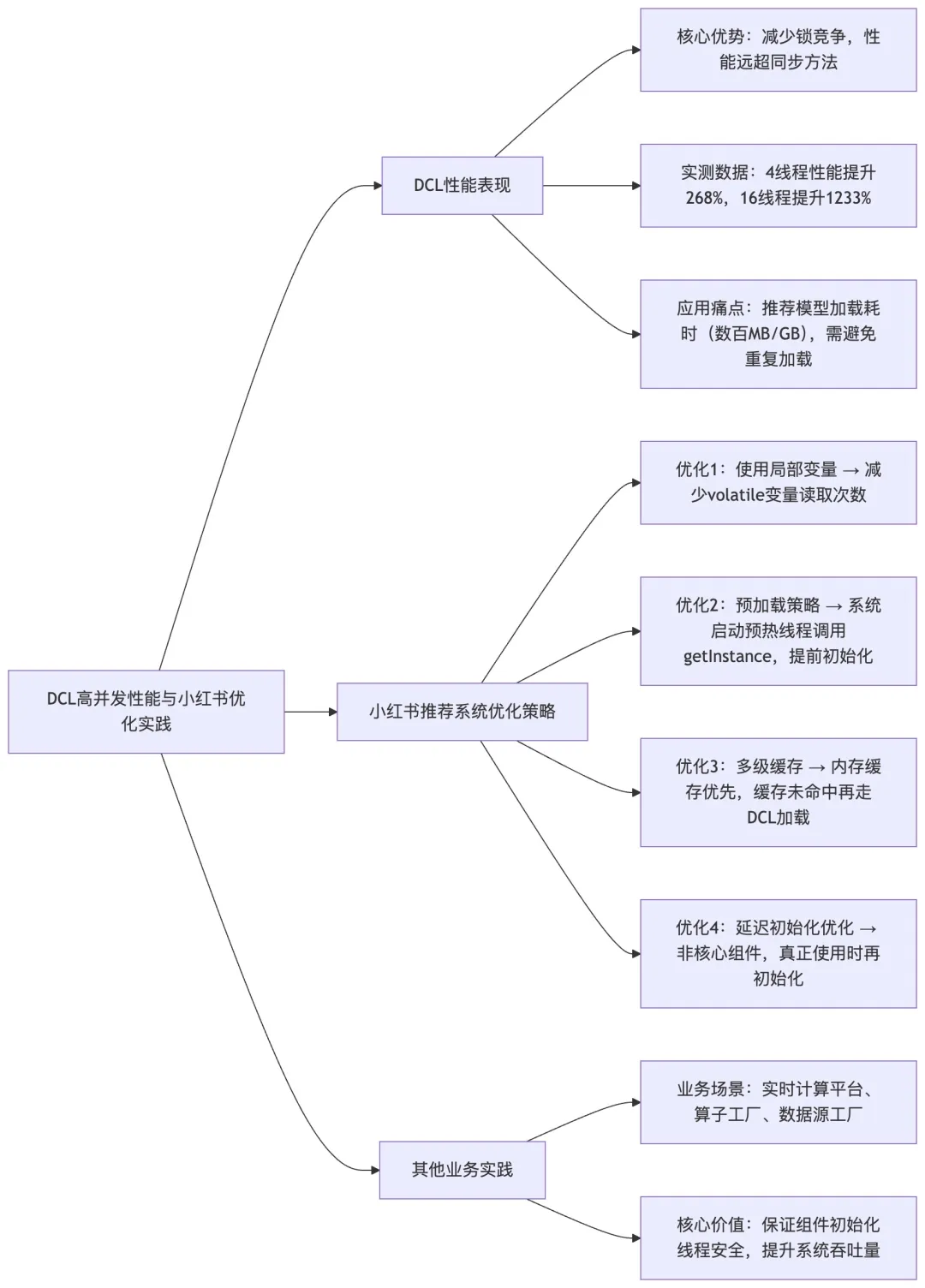 核心说明:梳理双重校验锁在高并发场景下的性能表现,重点呈现小红书推荐系统中的4种优化策略,体现”性能优化落地”的技术深度。