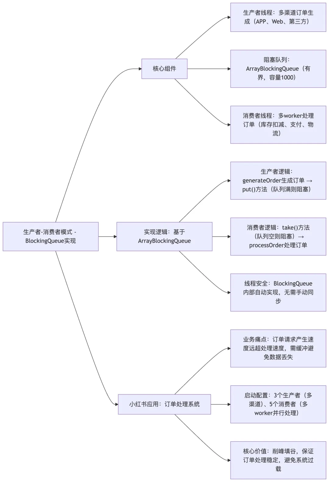 核心说明:梳理基于BlockingQueue的生产者-消费者模式实现逻辑、核心组件,关联小红书订单处理系统,体现模式在”流量缓冲”中的业务价值。