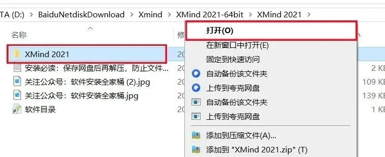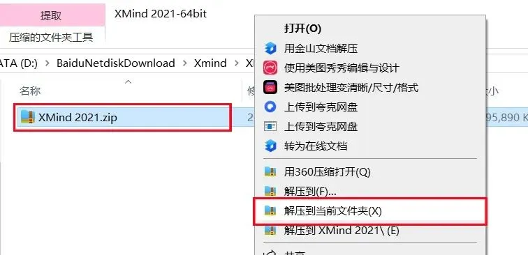 1.打开下载的Xmind 2021软件安装包,鼠标右击压缩包选择【解压到当前文件夹】。