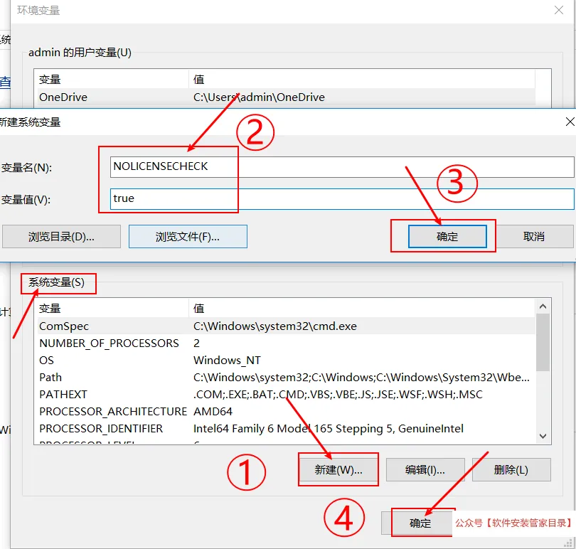 11.在系统变量中选择新建,在变量名中填写:NOLICENSECHECK,然后在变量值中填写:true,然后点击确定,再次点击确定保存;