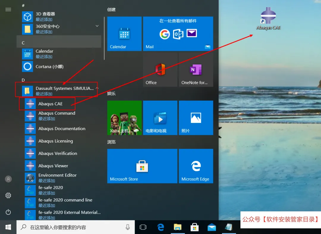 51.在菜单的最近添加中找到Abaqus CAE软件,鼠标拖拽至桌面创建桌面快捷方式;