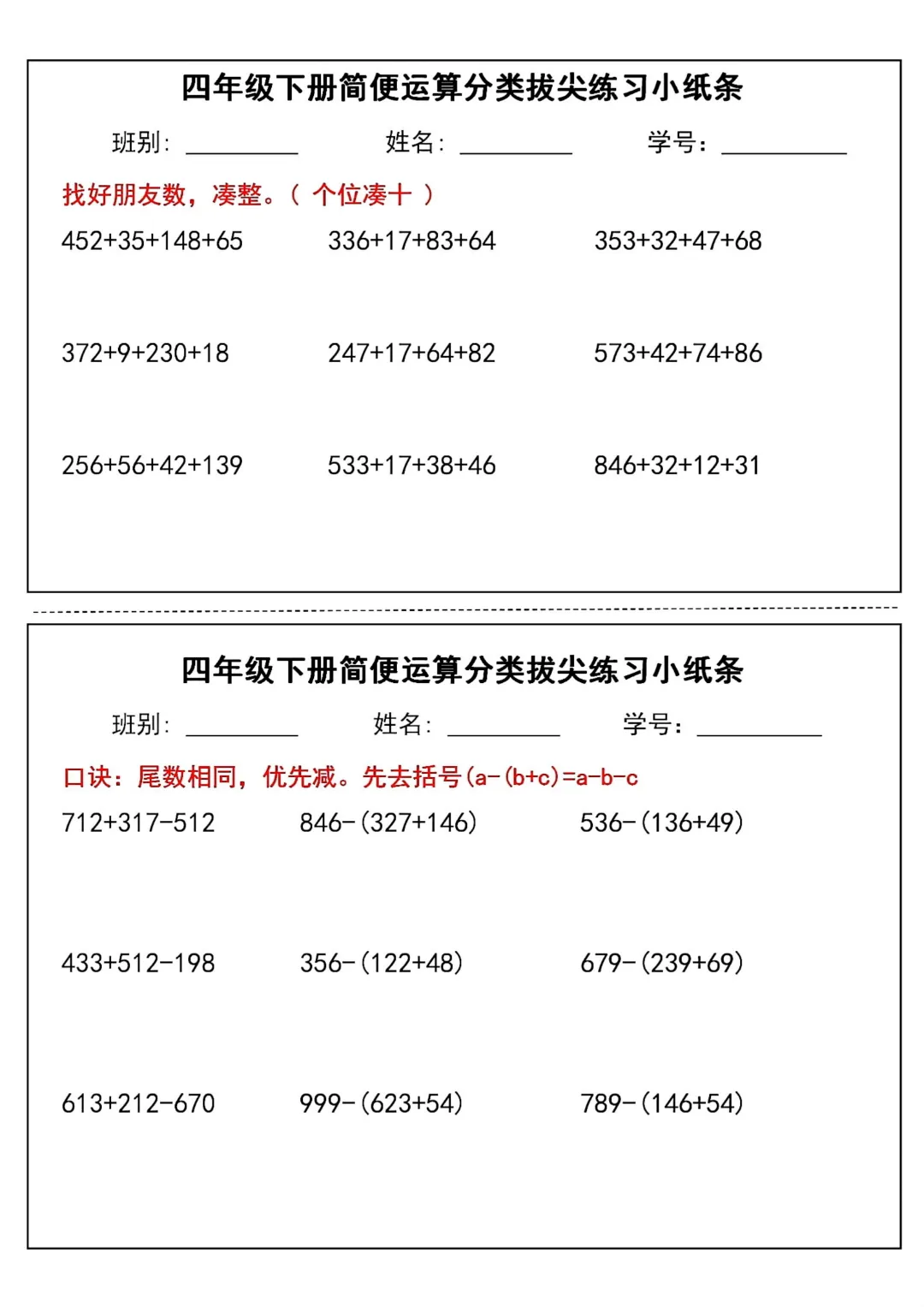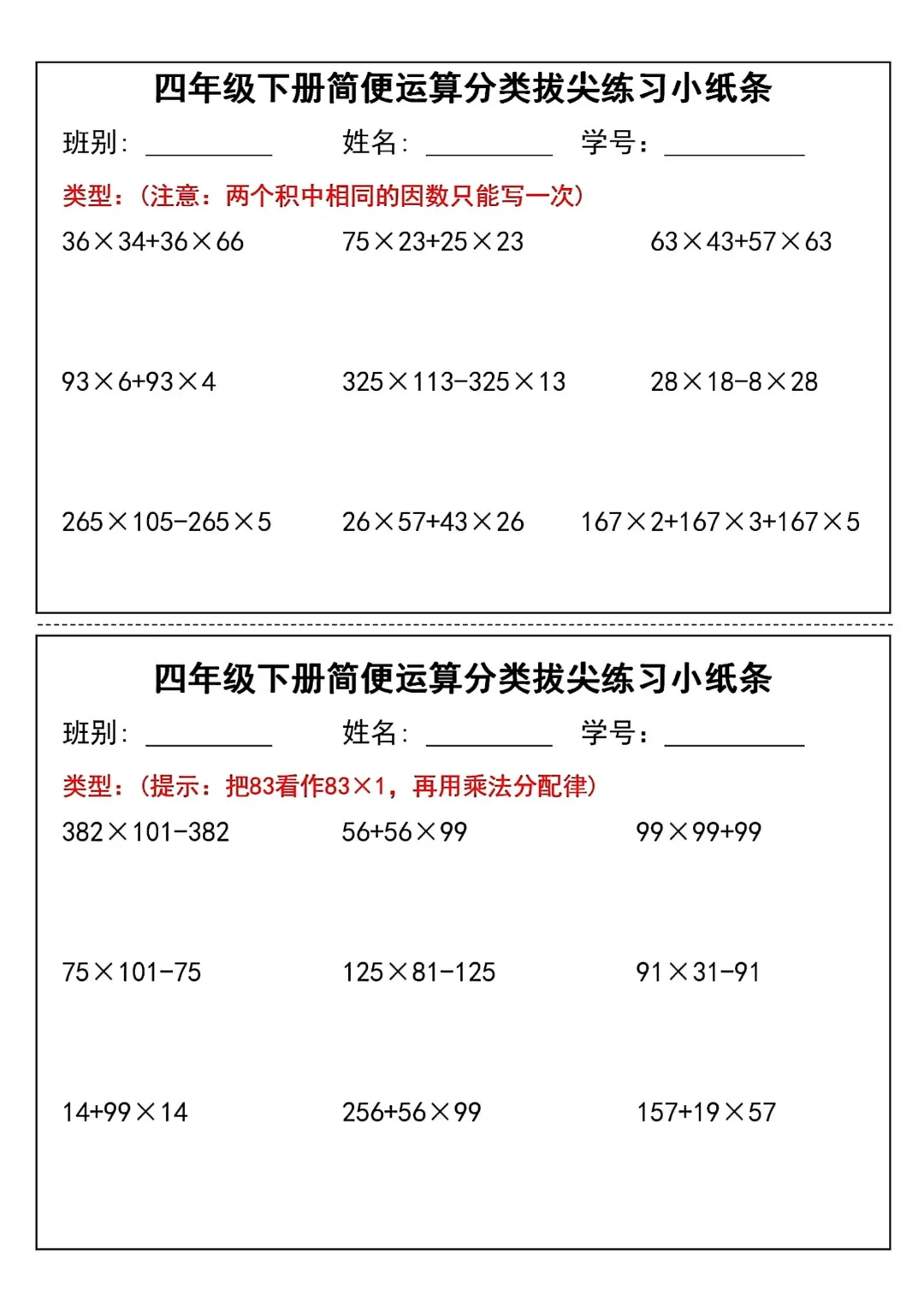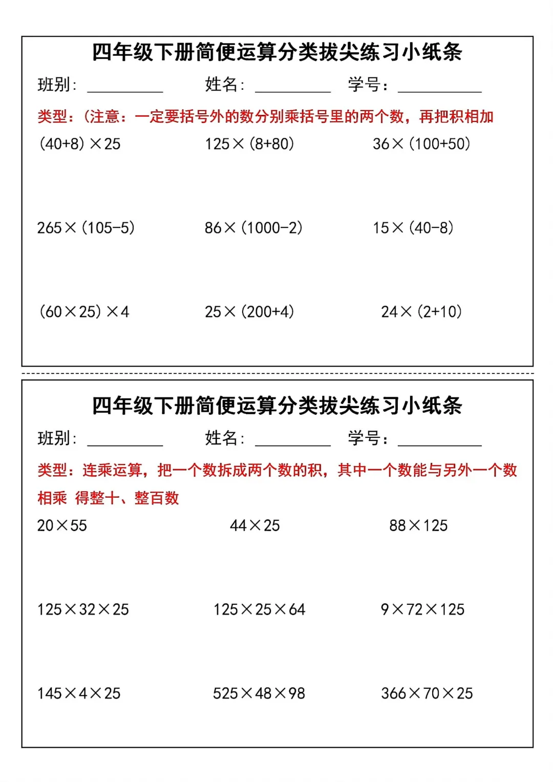 今天给大家分享的是:【四年级下册数学通用版】简便运算分类拔尖练习小纸条(1)丨完整高清电子版可打印
