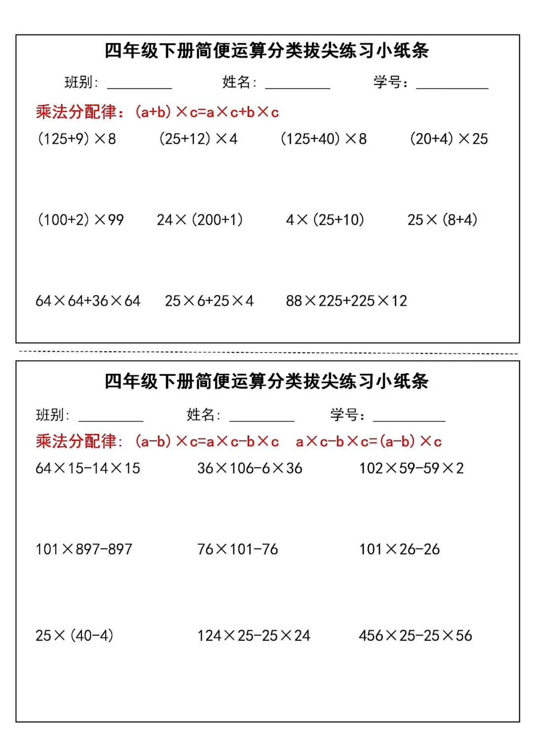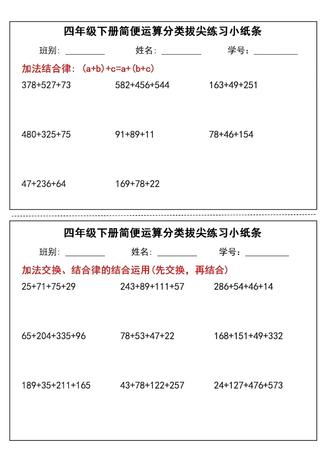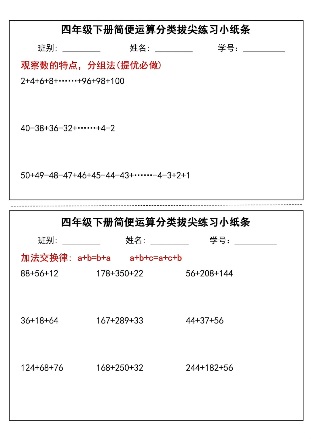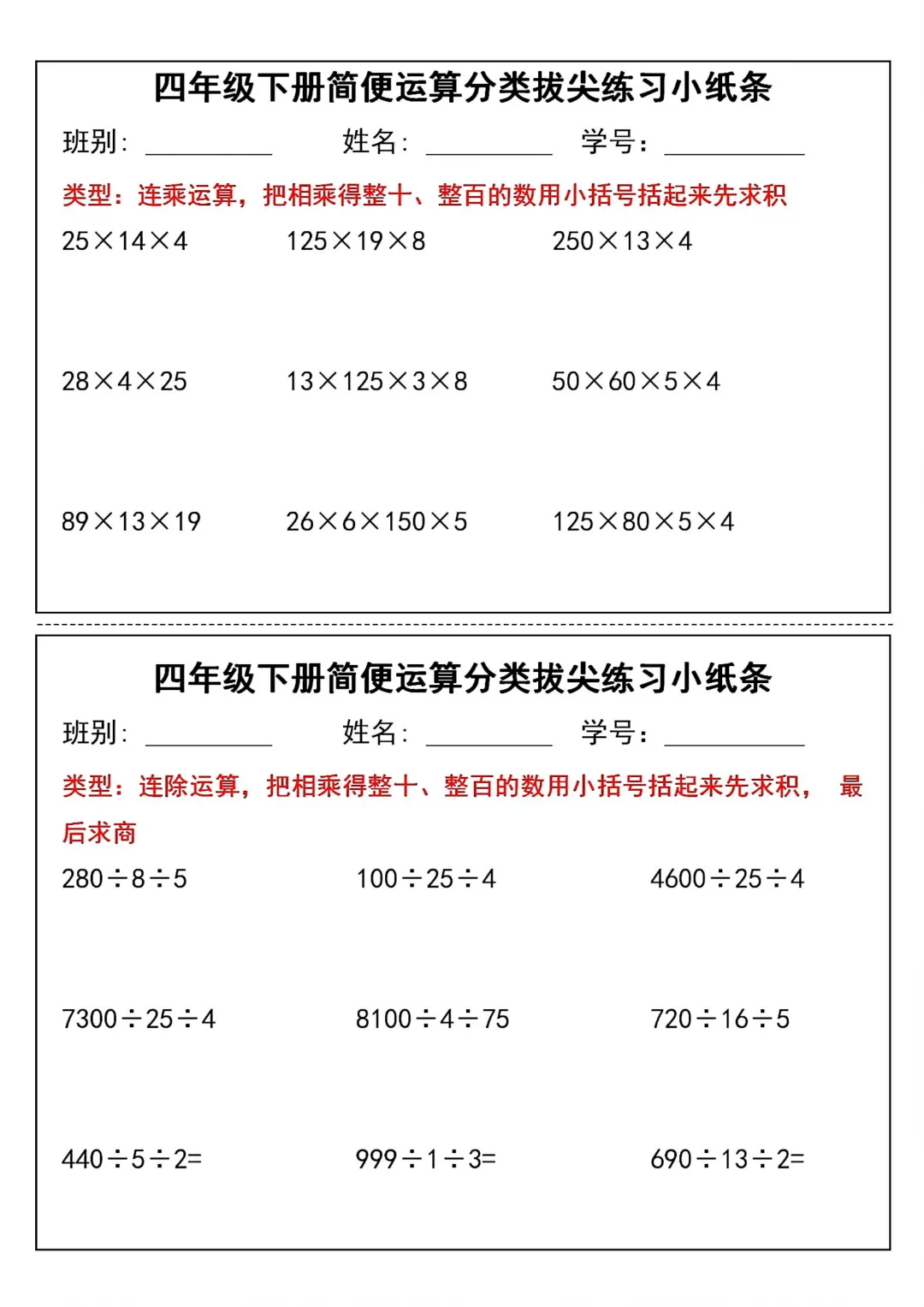 今天给大家分享的是:【四年级下册数学通用版】简便运算分类拔尖练习小纸条(1)丨完整高清电子版可打印
