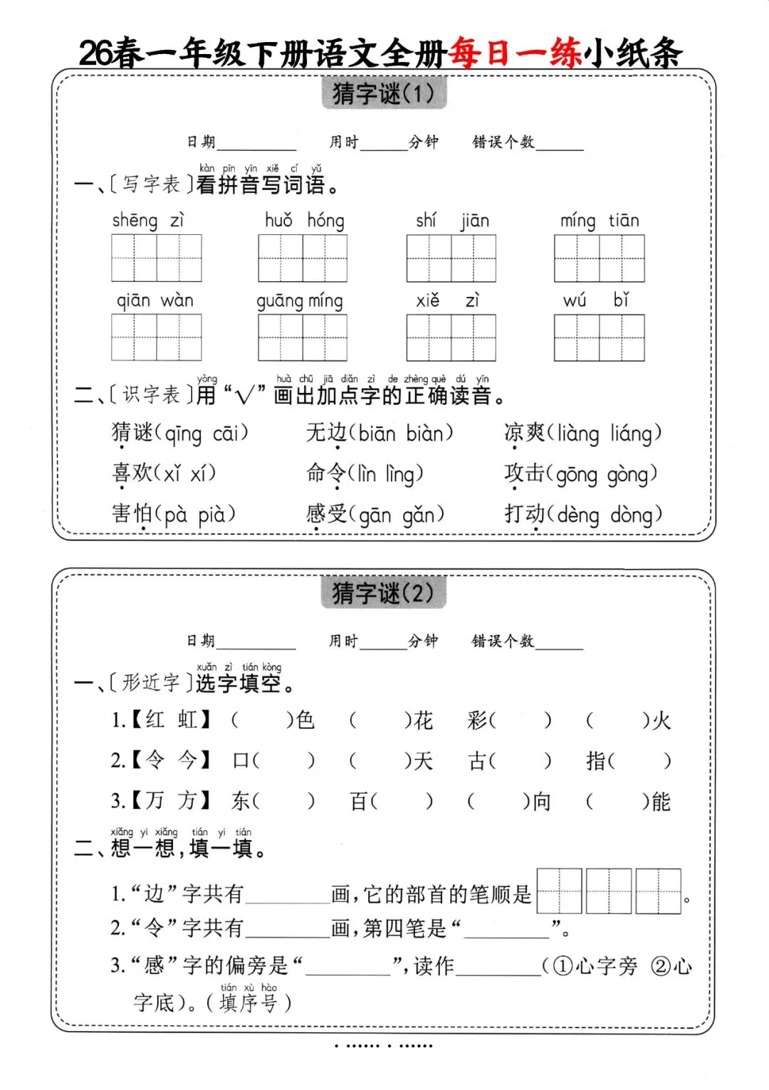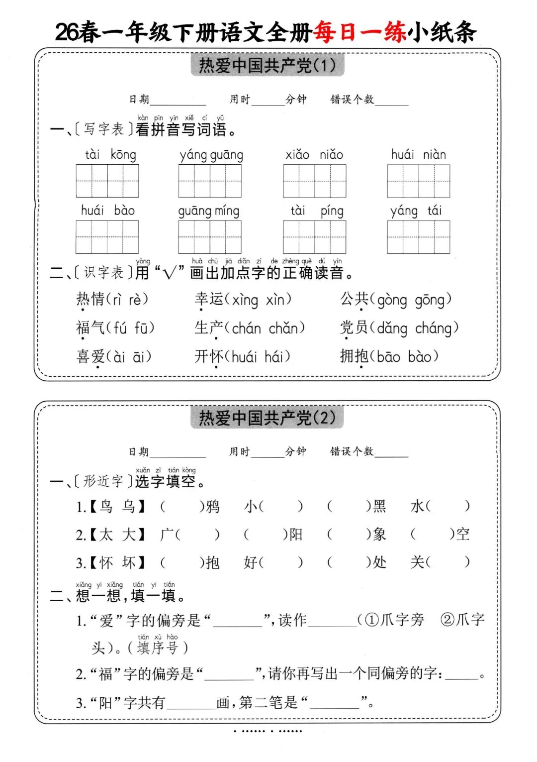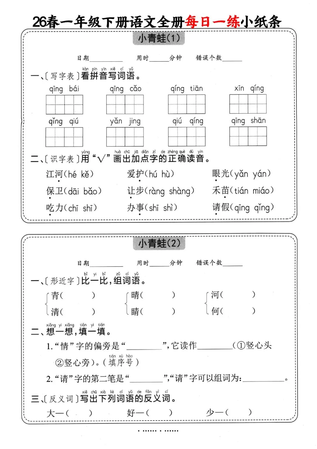 一年级(下)语文《全册每日一练小纸条》,可下载打印 文末有高清电子版领取方式 由于篇幅有限,高清完整版请下载电子版哦 领取完整电子版方式: ①:发财的小手点一点右下角“👍”和“❤️” ②:关注公众号后,在对话框中回复:003 (点击名片可直接关注)↑↑↑