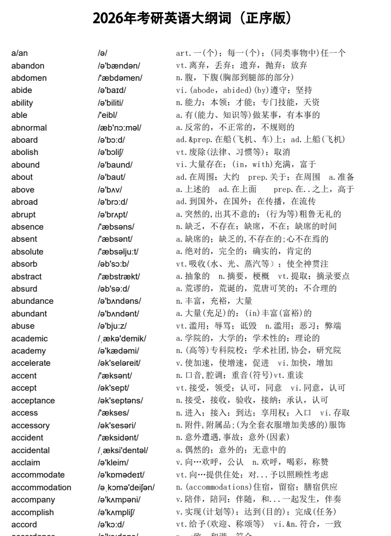 宝宝们!考研英语必备【5500大纲词汇】高清PDF终于整理出来啦!亲测排版超清爽,按字母顺序排列,每个单词带音标+词性+中文释义,重点词汇还有常用搭配和例句~二十七考研的亲们闭眼存!不管是基础积累还是冲刺复习,这份词汇表都是刷单词的必备神器!🌟🔸 大纲全覆盖:收录教育部考试中心发布的考研英语全部5500个核心词汇,一表搞定不遗漏🔸 排版超友好:专业设计,字体清晰、间距合理,可直接打印装订成册,随时随地翻看记忆🔸 重点有标注:部分核心词附带常用搭配和真题例句,背单词同时掌握用法,一举两得✅ 艾宾浩斯打卡:配合记忆曲线表格,每天1-2个字母,定期复习巩固✅ 碎片时间刷词:PDF存入手机/平板,吃饭排队通勤时随时翻看✅ 打印纸质版:建议打印出来手写标注,把不认识的重点词圈出来反复背