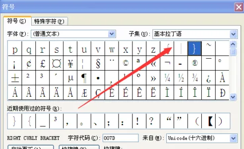 2、在word中还有另个一种方法可以打出普通大括号,点击:插入→符号,在符号对话框中“子集”选项中选择:基本拉丁语,就可以看到你想要的大括号了。
