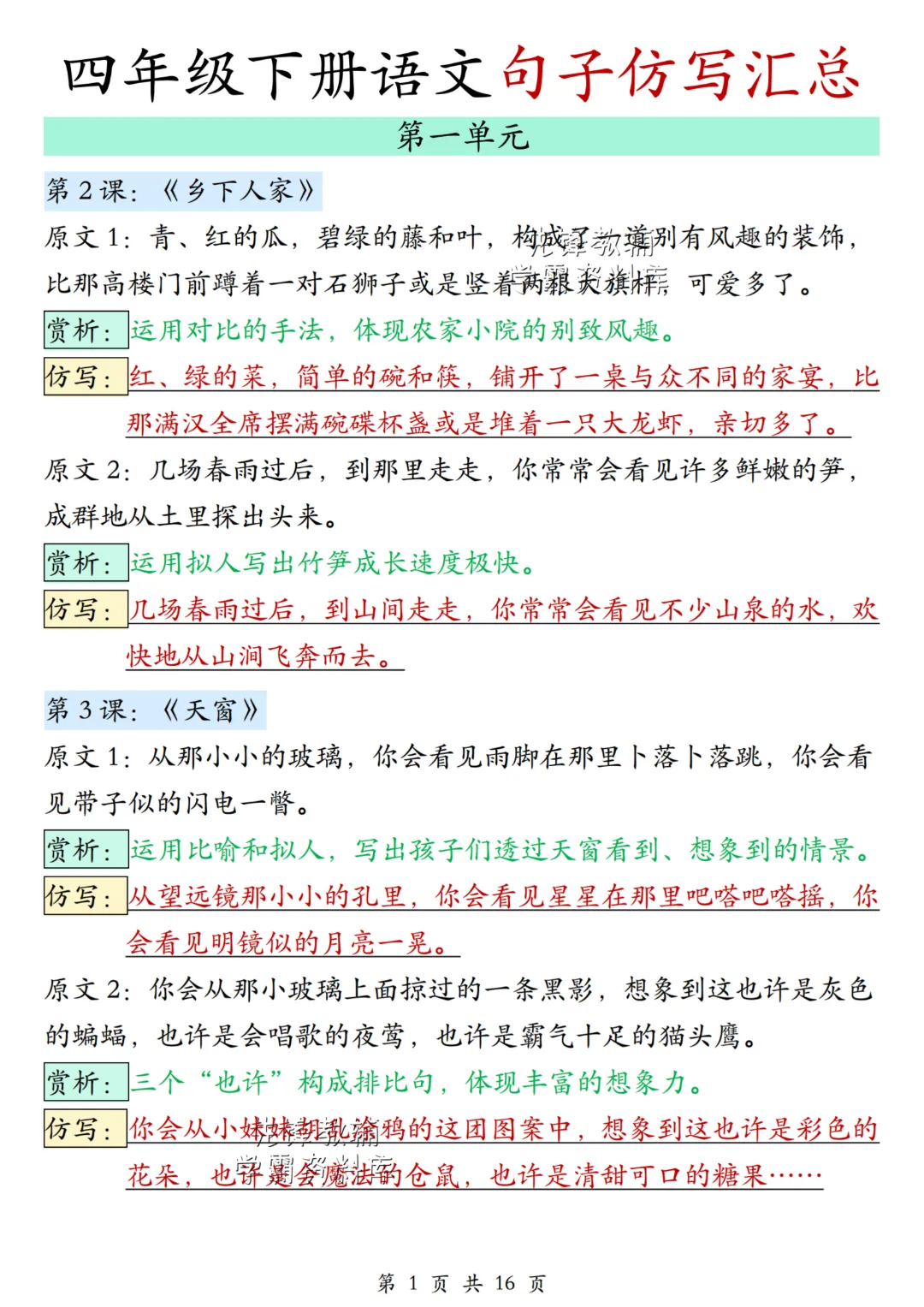 今日分享2026年《四年级下册语文句子仿写汇总》电子版可打印。共20页