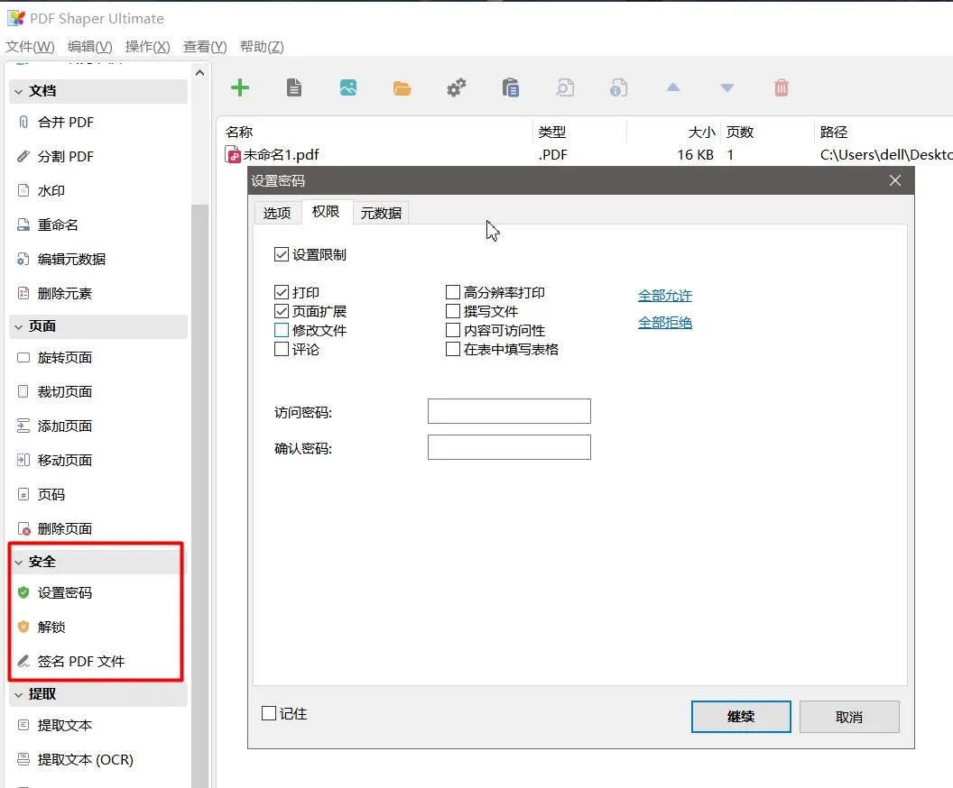 安全保护:用 PDF Shaper 可以加密保护你的 PDF 文档,既能设置文档密码和用户密码,也能添加文档使用限制,还能通过一个或多个数字签名给 PDF 签名,防止文档被未经授权的人访问和修改。