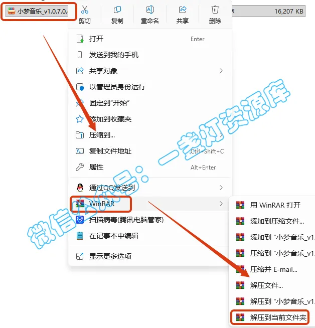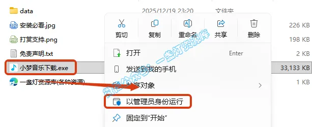2.打开刚刚解压的文件夹,鼠标右键点击【小梦音乐下载.exe】选择【以管理员身份运行】