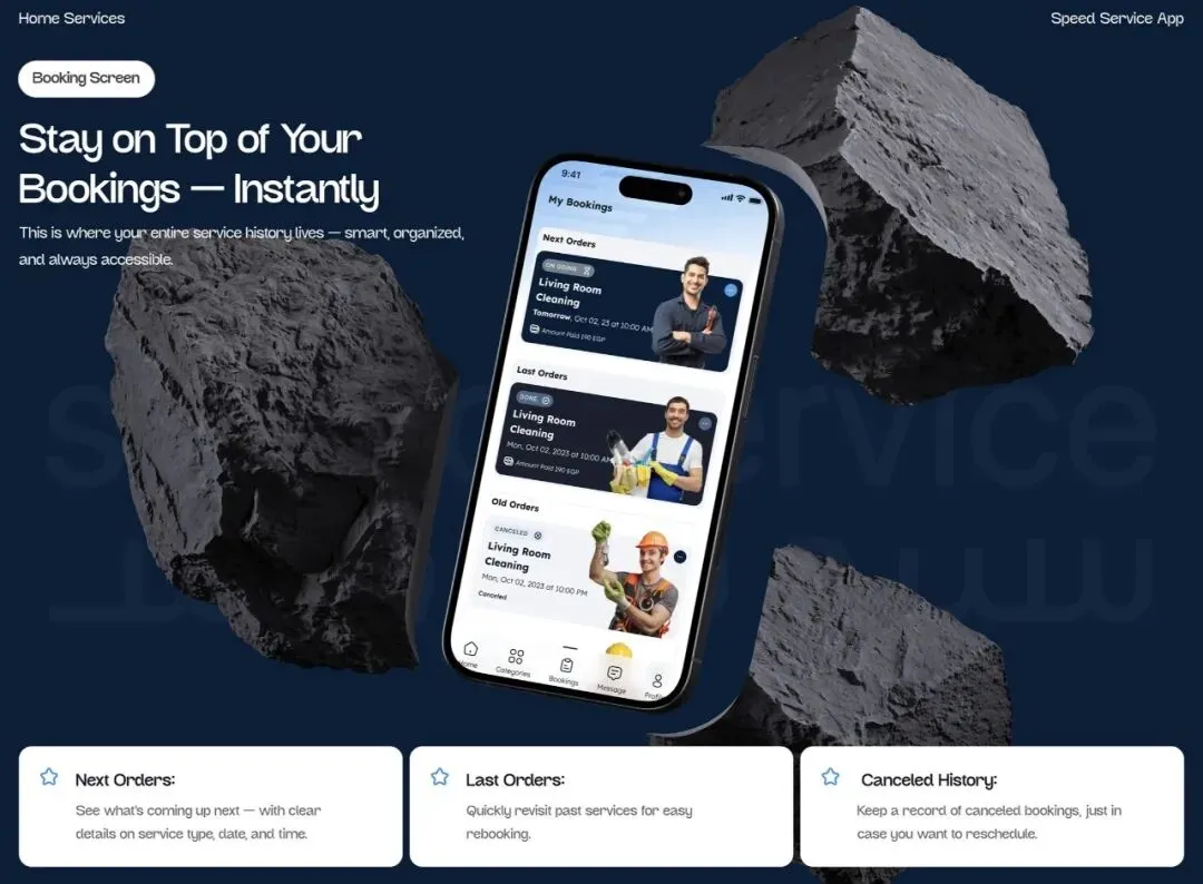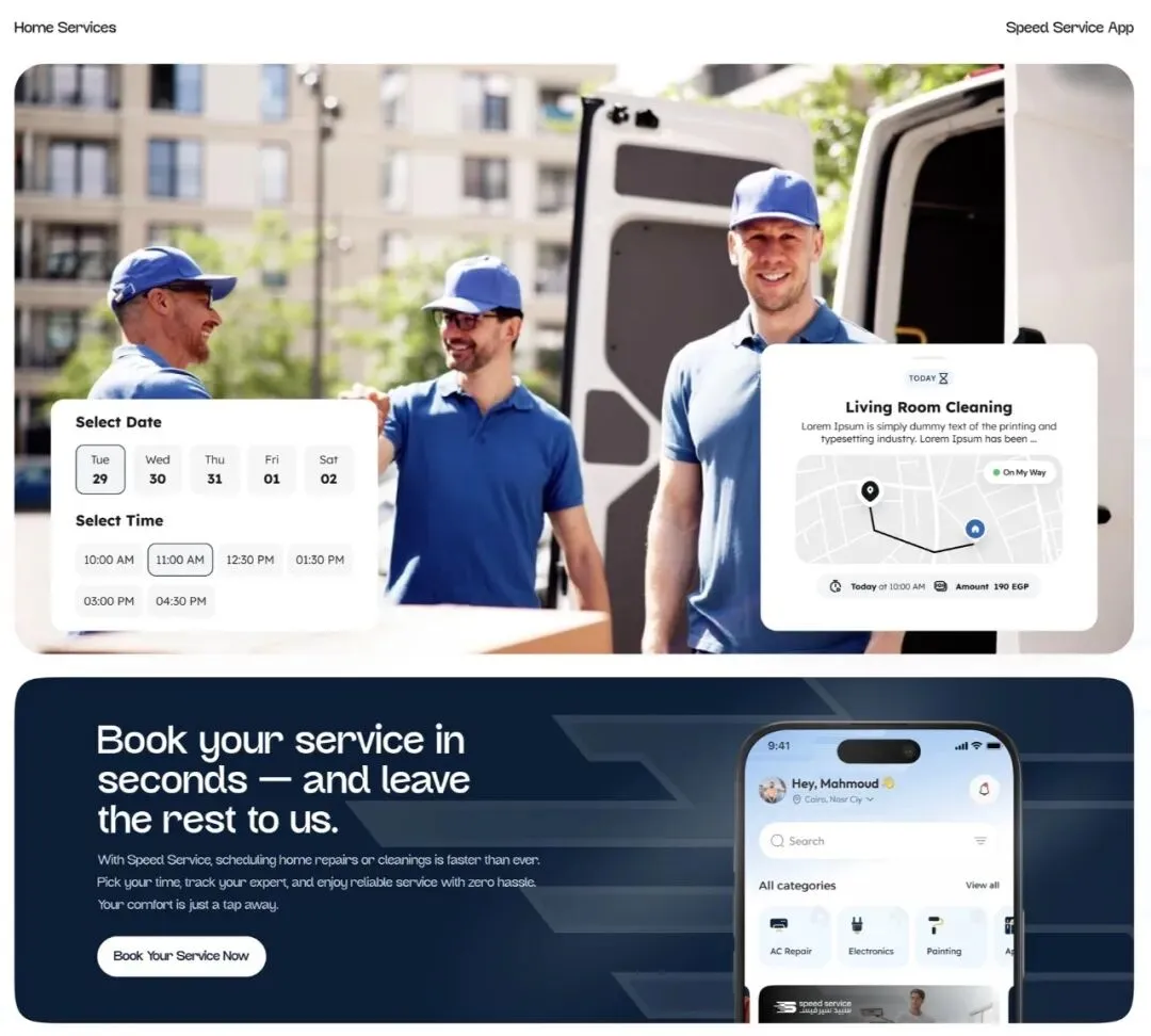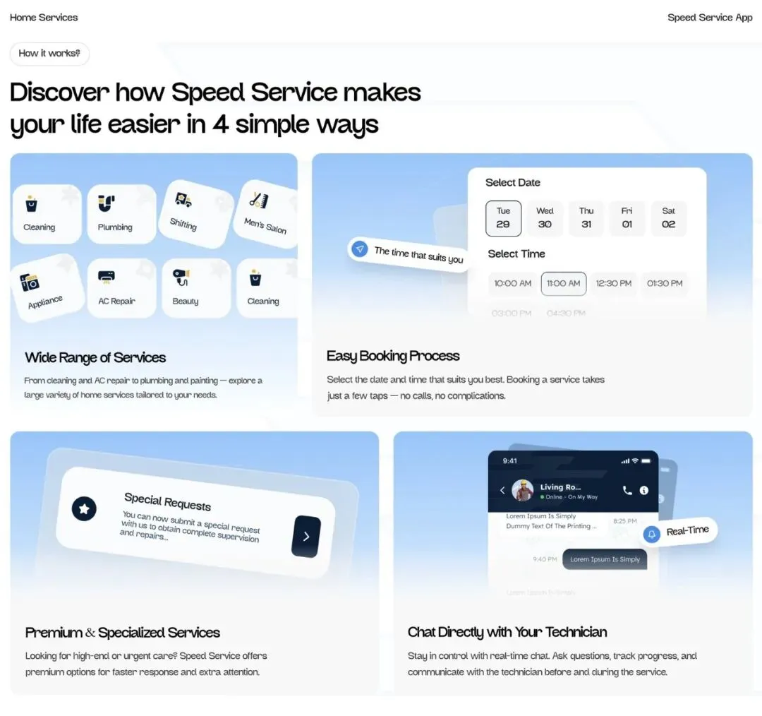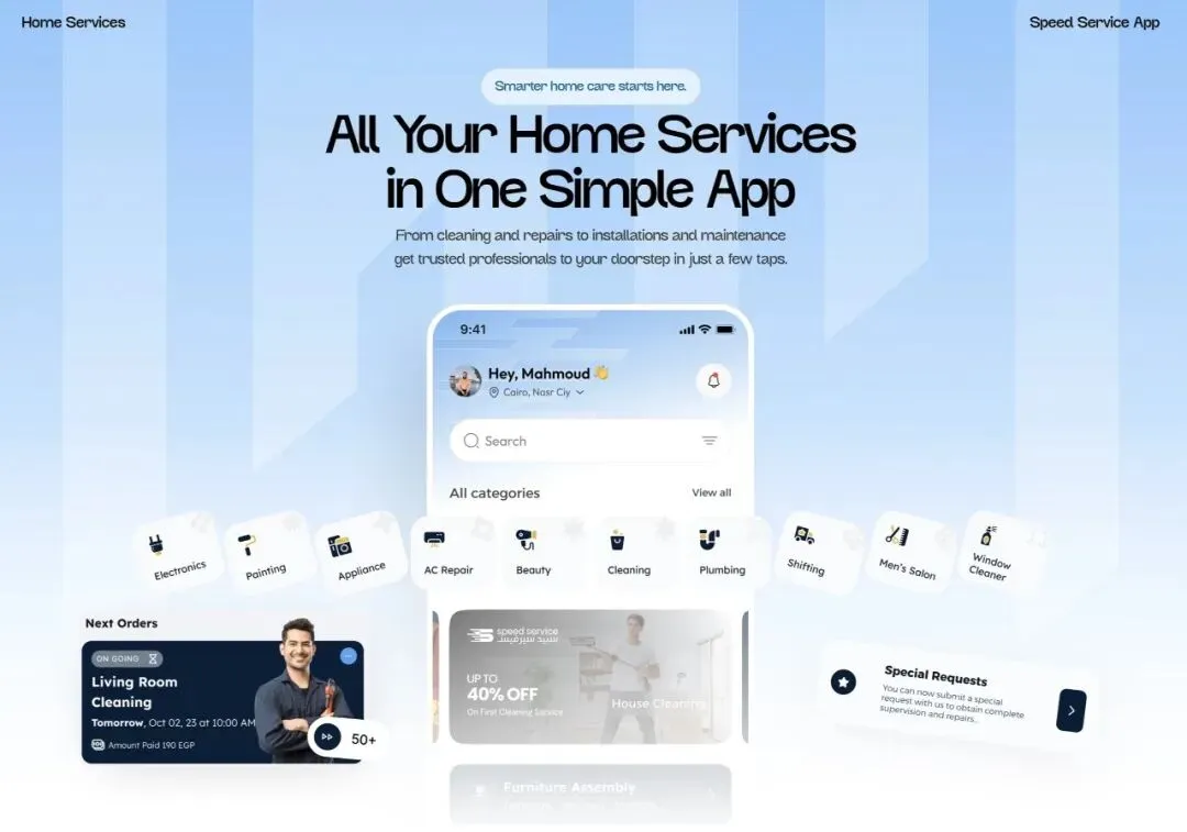 界面设计的简化与直观化 为了快速响应用户需求,界面设计遵循简洁明了的原则。例如,使用高度可识别的图标(如扫帚代表保洁)和柔和的品牌色彩,减少用户的认知负荷。同时,通过优化搜索功能和简化预约流程,让用户能迅速找到所需服务。