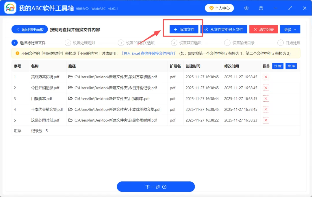 2、点击右上方【添加文件】,或将所有需要处理的PDF文件拖拽到软件界面,上传好待处理文件。