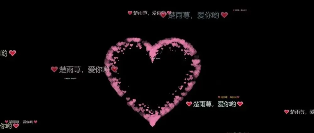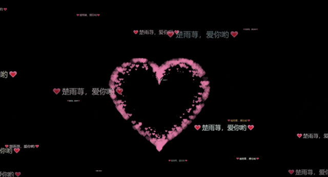 var loverName = "💗楚雨荨,爱你哟💗"const colors = ["#eec996","#8fb7d3","#b7d4c6","#c3bedd","#f1d5e4","#cae1d3","#f3c89d","#d0b0c3","#819d53","#c99294","#cec884","#ff8e70","#e0a111","#fffdf6","#cbd7ac","#e8c6c0","#dc9898","#ecc8ba",]; //用来设置的颜�� var canvas = document.getElementById("canvas");var ctx = canvas.getContext("2d");let count = 1;var ww = window.innerWidth;var wh = window.innerHeight;var hearts = [];functioninit() { requestAnimationFrame(render); canvas.width = ww; canvas.height = wh;for (var i = 0; i < 100; i++) { hearts.push(new Heart()); }}functionHeart() {this.x = Math.random() * ww;this.y = Math.random() * wh;this.opacity = Math.random() * 0.5 + 0.5;this.vel = {x: (Math.random() - 0.5) * 4,y: (Math.random() - 0.5) * 4, };this.targetScale = Math.random() * 0.15 + 0.02;this.scale = this.targetScale * Math.random();}Heart.prototype.update = function (i) {this.x += this.vel.x;this.y += this.vel.y;this.scale += (this.targetScale - this.scale) * 0.01;if (this.x - this.width > ww || this.x + this.width < 0) {this.scale = 0;this.x = Math.random() * ww; }if (this.y - this.height > wh || this.y + this.height < 0) {this.scale = 0;this.y = Math.random() * wh; }this.width = 473.8;this.height = 408.6;};Heart.prototype.draw = function (i) { ctx.globalAlpha = this.opacity; ctx.font = `${180 * this.scale}px "微软雅黑"`;// ctx.font="20px"; ctx.fillStyle = colors[i % 18]; ctx.fillText( loverName,this.x - this.width * 0.5,this.y - this.height * 0.5,this.width,this.height );// ctx.drawImage(// heartImage,// this.x - this.width * 0.5,// this.y - this.height * 0.5,// this.width,// this.height// );};functionrender() { ctx.clearRect(0, 0, ww, wh);// ctx.globalAlpha = 1;// ctx.fillStyle = "rgba(255,255,255,0.3)";// ctx.fillRect(0, 0, ww, wh);for (var i = 0; i < 100; i++) { hearts[i].update(i); hearts[i].draw(i); } requestAnimationFrame(render);}init();window.addEventListener("resize", function () { ww = window.innerWidth; wh = window.innerHeight;});/* * Settings */var settings = {particles: {length: 500, // maximum amount of particlesduration: 2, // particle duration in secvelocity: 100, // particle velocity in pixels/seceffect: -0.75, // play with this for a nice effectsize: 30, // particle size in pixels },};/* * RequestAnimationFrame polyfill by Erik M?ller */(function () {var b = 0;var c = ["ms", "moz", "webkit", "o"];for (var a = 0; a < c.length && !window.requestAnimationFrame; ++a) {window.requestAnimationFrame = window[c[a] + "RequestAnimationFrame"];window.cancelAnimationFrame =window[c[a] + "CancelAnimationFrame"] ||window[c[a] + "CancelRequestAnimationFrame"]; }if (!window.requestAnimationFrame) {window.requestAnimationFrame = function (h, e) {var d = newDate().getTime();var f = Math.max(0, 16 - (d - b));var g = window.setTimeout(function () { h(d + f); }, f); b = d + f;return g; }; }if (!window.cancelAnimationFrame) {window.cancelAnimationFrame = function (d) { clearTimeout(d); }; }})();/* * Point class */var Point = (function () {functionPoint(x, y) {this.x = typeof x !== "undefined" ? x : 0;this.y = typeof y !== "undefined" ? y : 0; } Point.prototype.clone = function () {returnnew Point(this.x, this.y); }; Point.prototype.length = function (length) {if (typeof length == "undefined")returnMath.sqrt(this.x * this.x + this.y * this.y);this.normalize();this.x *= length;this.y *= length;returnthis; }; Point.prototype.normalize = function () {var length = this.length();this.x /= length;this.y /= length;returnthis; };return Point;})();/* * Particle class */var Particle = (function () {functionParticle() {this.position = new Point();this.velocity = new Point();this.acceleration = new Point();this.age = 0; } Particle.prototype.initialize = function (x, y, dx, dy) {this.position.x = x;this.position.y = y;this.velocity.x = dx;this.velocity.y = dy;this.acceleration.x = dx * settings.particles.effect;this.acceleration.y = dy * settings.particles.effect;this.age = 0; }; Particle.prototype.update = function (deltaTime) {this.position.x += this.velocity.x * deltaTime;this.position.y += this.velocity.y * deltaTime;this.velocity.x += this.acceleration.x * deltaTime;this.velocity.y += this.acceleration.y * deltaTime;this.age += deltaTime; }; Particle.prototype.draw = function (context, image) {functionease(t) {return --t * t * t + 1; }var size = image.width * ease(this.age / settings.particles.duration); context.globalAlpha = 1 - this.age / settings.particles.duration; context.drawImage( image,this.position.x - size / 2,this.position.y - size / 2, size, size ); };return Particle;})();/* * ParticlePool class */var ParticlePool = (function () {var particles, firstActive = 0, firstFree = 0, duration = settings.particles.duration;functionParticlePool(length) {// create and populate particle pool particles = newArray(length);for (var i = 0; i < particles.length; i++) particles[i] = new Particle(); } ParticlePool.prototype.add = function (x, y, dx, dy) { particles[firstFree].initialize(x, y, dx, dy);// handle circular queue firstFree++;if (firstFree == particles.length) firstFree = 0;if (firstActive == firstFree) firstActive++;if (firstActive == particles.length) firstActive = 0; }; ParticlePool.prototype.update = function (deltaTime) {var i;// update active particlesif (firstActive < firstFree) {for (i = firstActive; i < firstFree; i++) particles[i].update(deltaTime); }if (firstFree < firstActive) {for (i = firstActive; i < particles.length; i++) particles[i].update(deltaTime);for (i = 0; i < firstFree; i++) particles[i].update(deltaTime); }// remove inactive particleswhile ( particles[firstActive].age >= duration && firstActive != firstFree ) { firstActive++;if (firstActive == particles.length) firstActive = 0; } }; ParticlePool.prototype.draw = function (context, image) {// draw active particlesif (firstActive < firstFree) {for (i = firstActive; i < firstFree; i++) particles[i].draw(context, image); }if (firstFree < firstActive) {for (i = firstActive; i < particles.length; i++) 