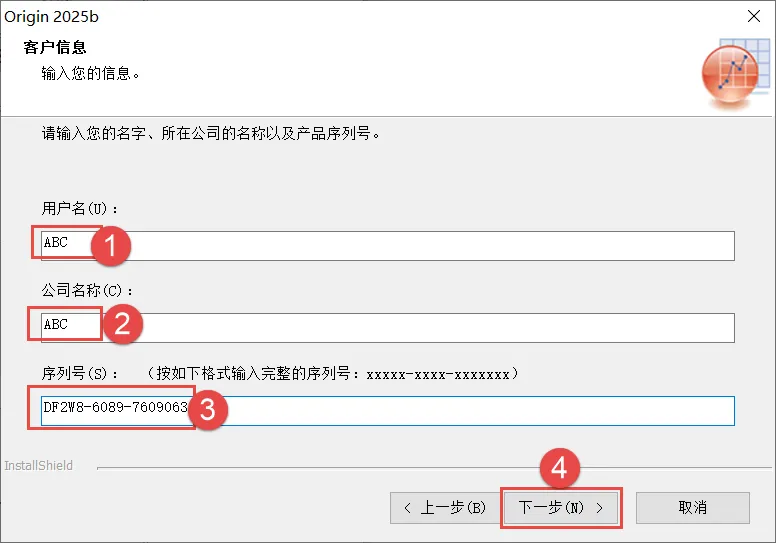 7.①②用户名和公司名称随意填写,③序列号填写DF2W8-6089-7609063,④点击【下一步】。