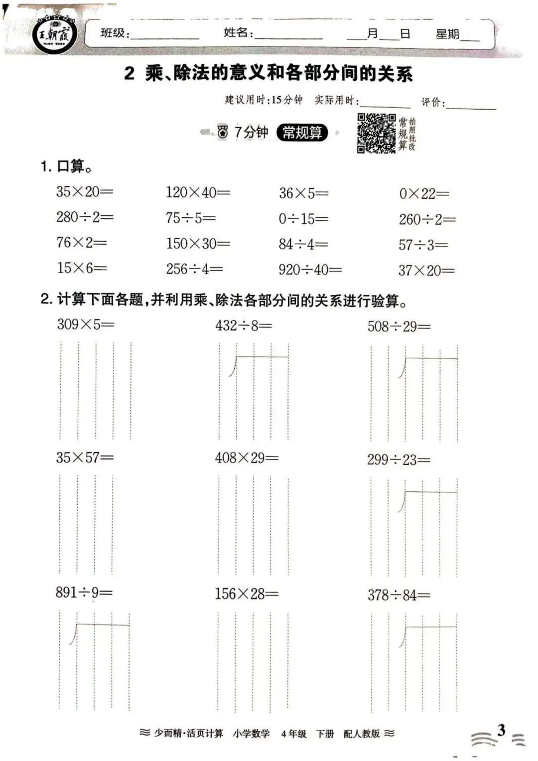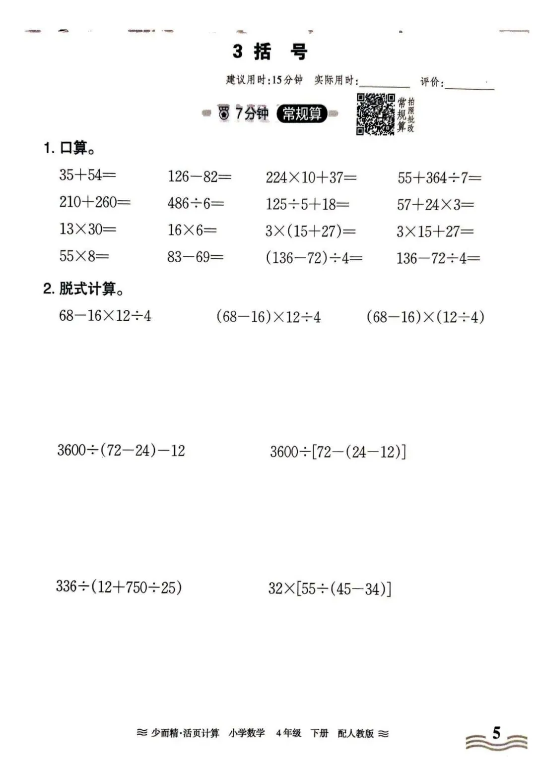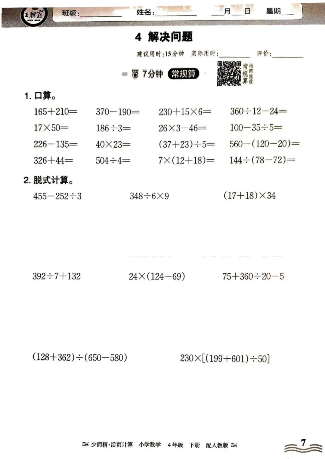 人教数学四年级下册《活页计算》丨 可下载打印