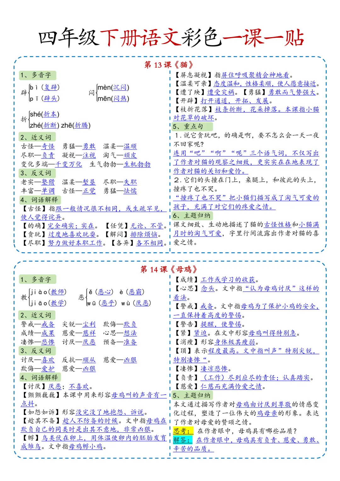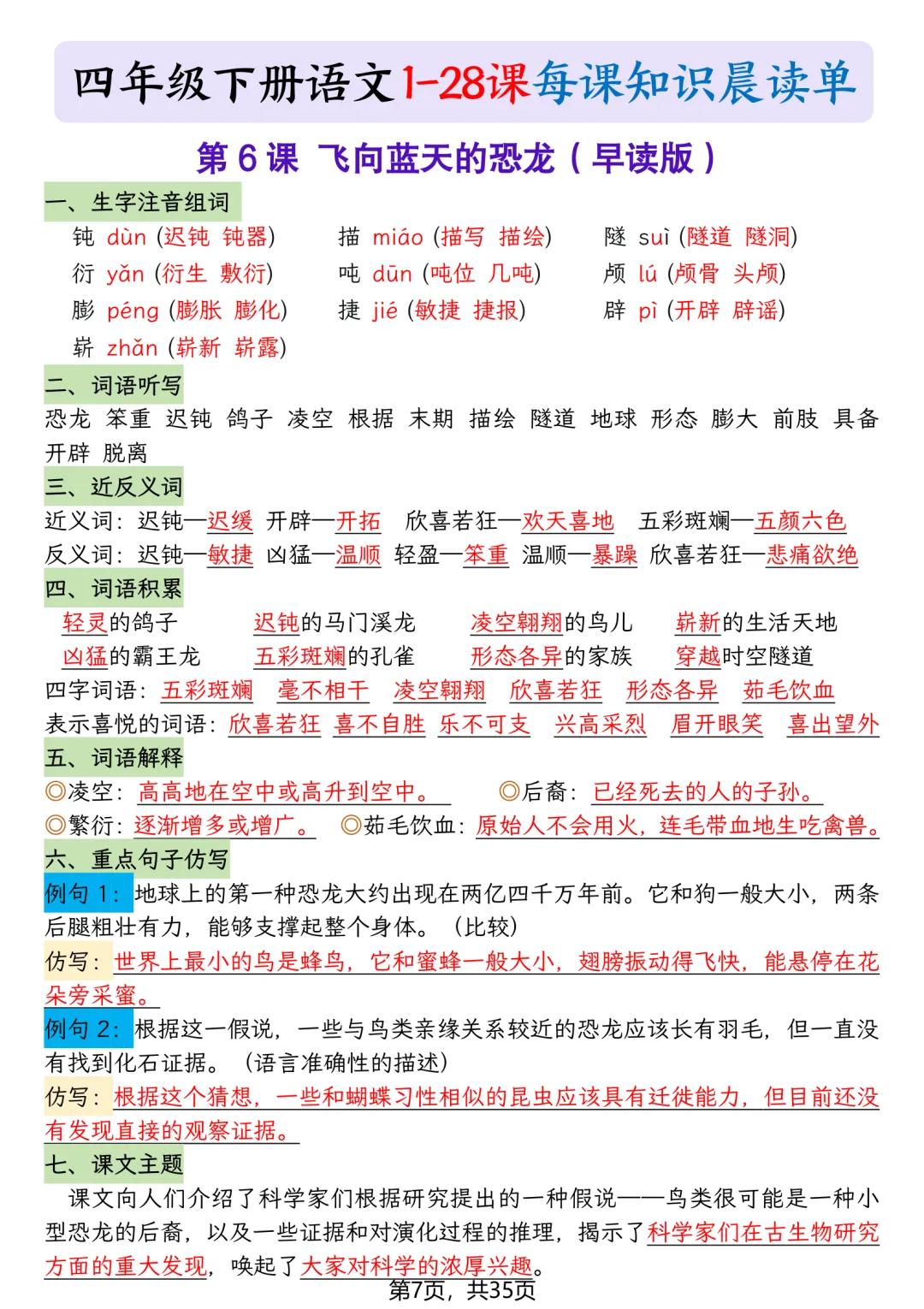 2026春最新版:《四年级语文下册彩色课课贴+1-28课每课知识晨读单》可打印