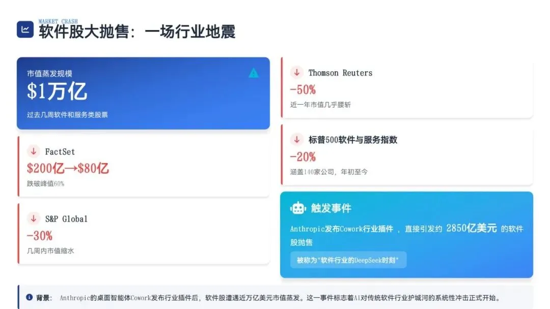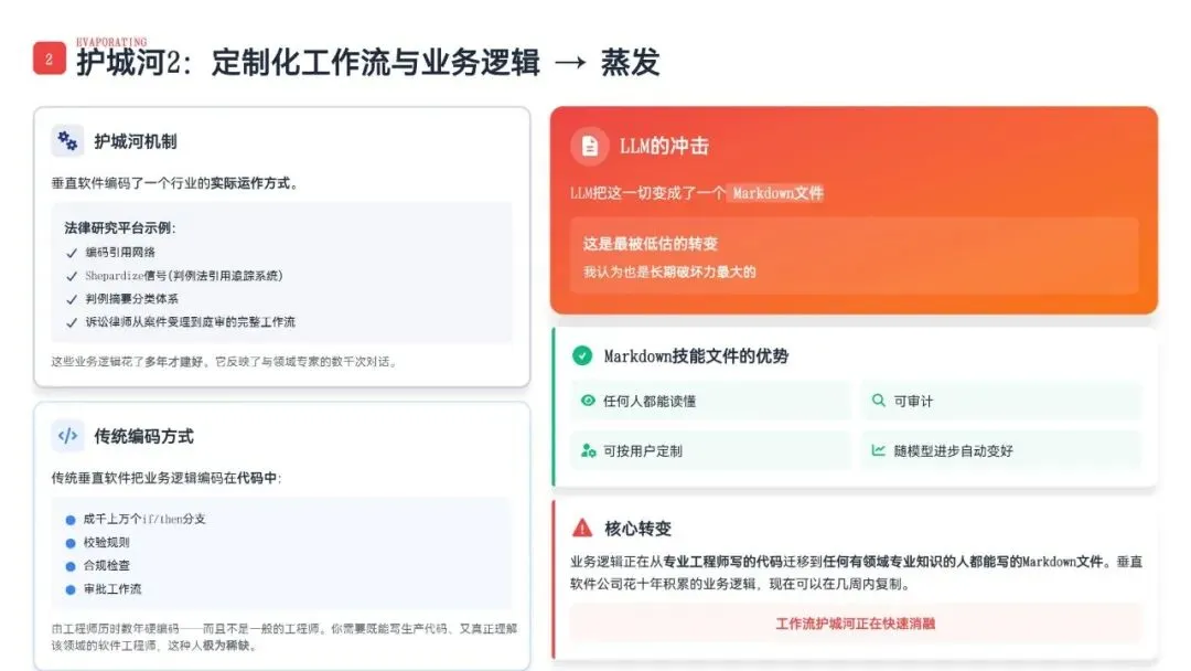 LLM技术的快速发展正对垂直软件行业发起系统性冲击,Anthropic发布Cowork行业插件引发的软件股近万亿美元市值蒸发,成为这一变革的标志性节点,也被称作软件行业的DeepSeek时刻。传统垂直软件赖以建立的十条护城河迎来分化,习得性界面、定制化工作流、公开数据访问等五条护城河被LLM逐步摧毁或削弱,而私有独占数据、监管合规锁定、网络效应等五条护城河仍保持稳固甚至得到强化。这一变化直接导致行业进入壁垒崩塌,竞争格局从少数玩家主导转向海量参与者涌入,估值逻辑也因定价权和护城河的重构发生根本性改变。本报告由拥有垂直SaaS双重视角的行业从业者撰写,深度解析LLM对垂直软件各条护城河的冲击机制,通过攻防全景分析、风险评估框架搭建,厘清行业变革的核心逻辑,并为垂直软件企业提供未来生存与发展的战略启示,揭示AI时代垂直软件护城河的重构路径与行业发展新方向。