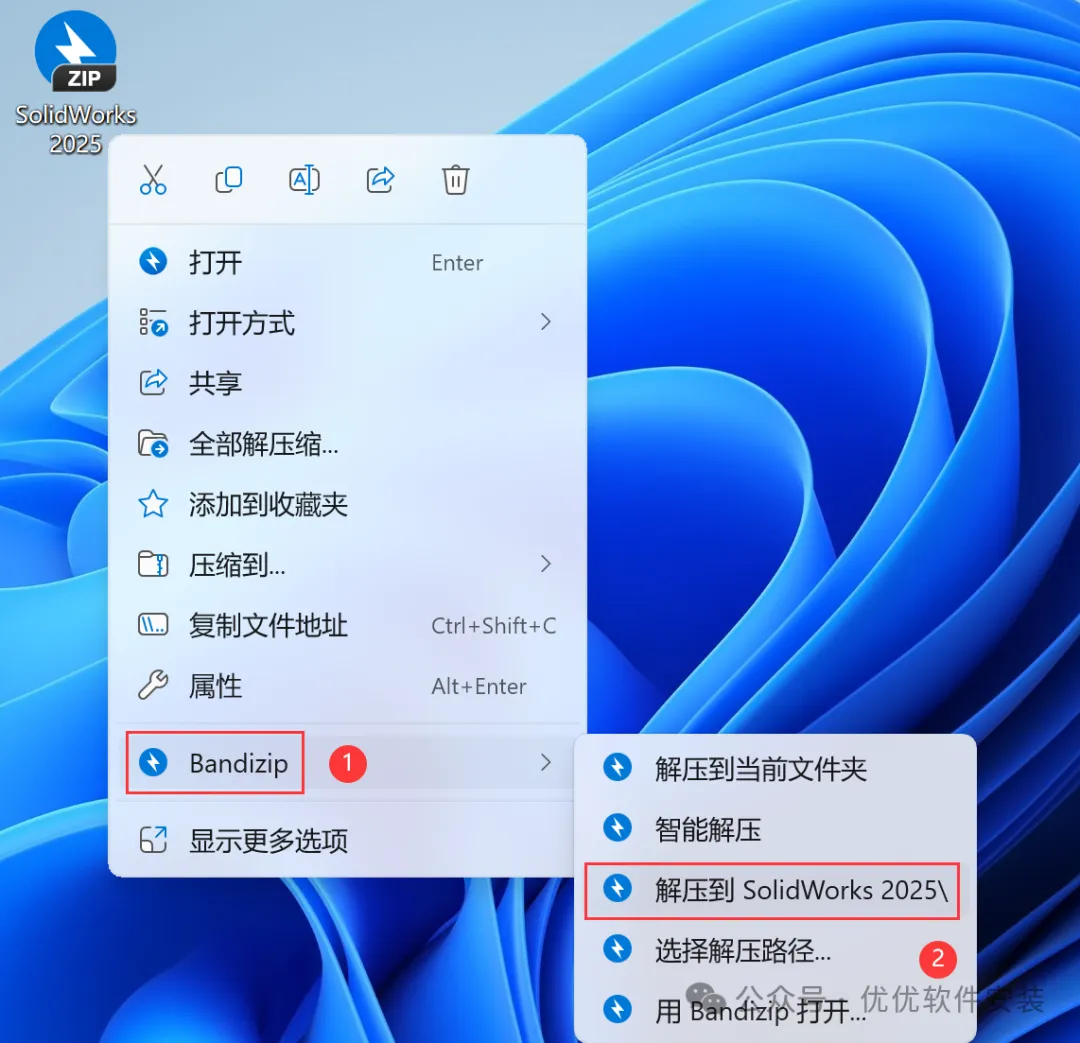 1、下载SolidWorks 2025软件安装包到电脑上,右键选择【解压到SolidWorks 2025\】