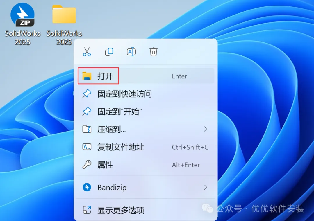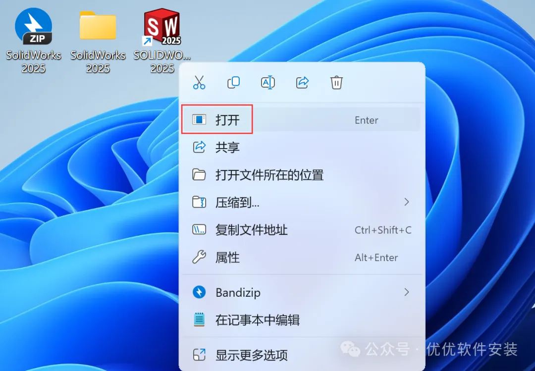 34、回到桌面,右键桌面上的【SolidWorks 2025软件图标】,点击【打开】