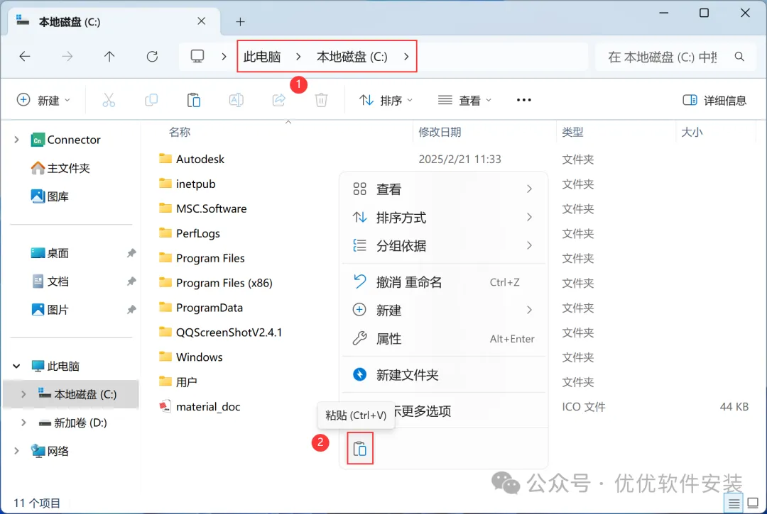 8、打开本地C盘,再右键文件夹的空白处,点击【粘贴按钮】