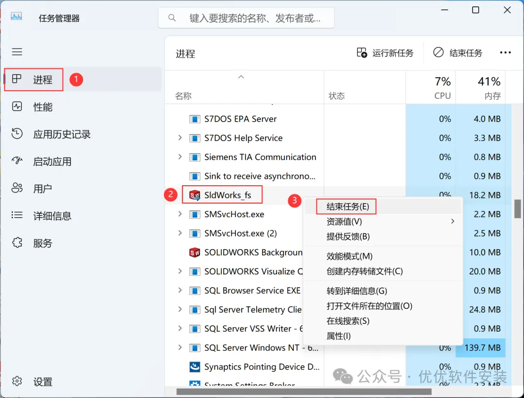 29、找到【SldWorks_fs】,再点击【结束任务】
