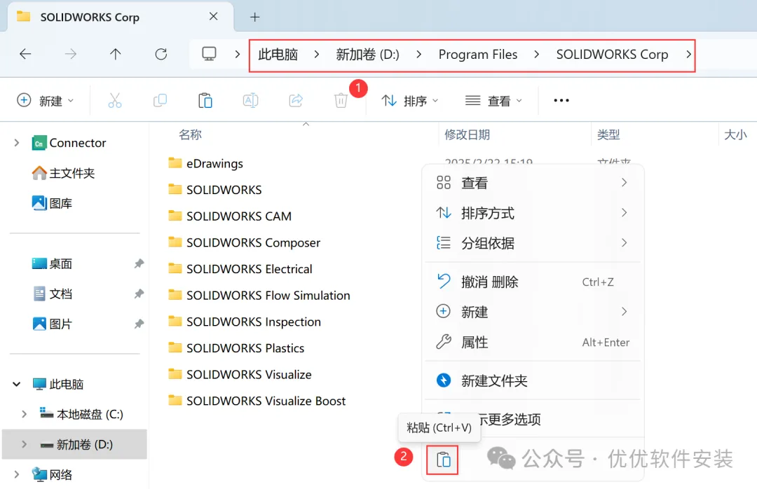 32、打开软件安装路径:D:\Program Files\SOLIDWORKS Corp,步骤19可查看,再右键文件夹的空白处,点击【粘贴按钮】