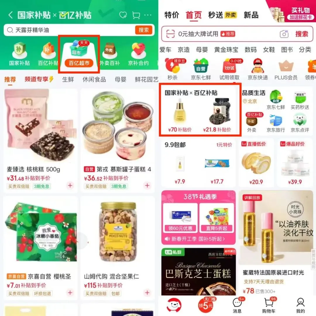 整体来看,京东“百亿超市”的核心火力聚焦于生鲜与快消两大品类。补贴范围不仅覆盖了休食、酒水饮料、粮油调味等食品饮品,还包含了家清、个护、母婴、宠物等生活日用品,以及部分京喜自营商品。