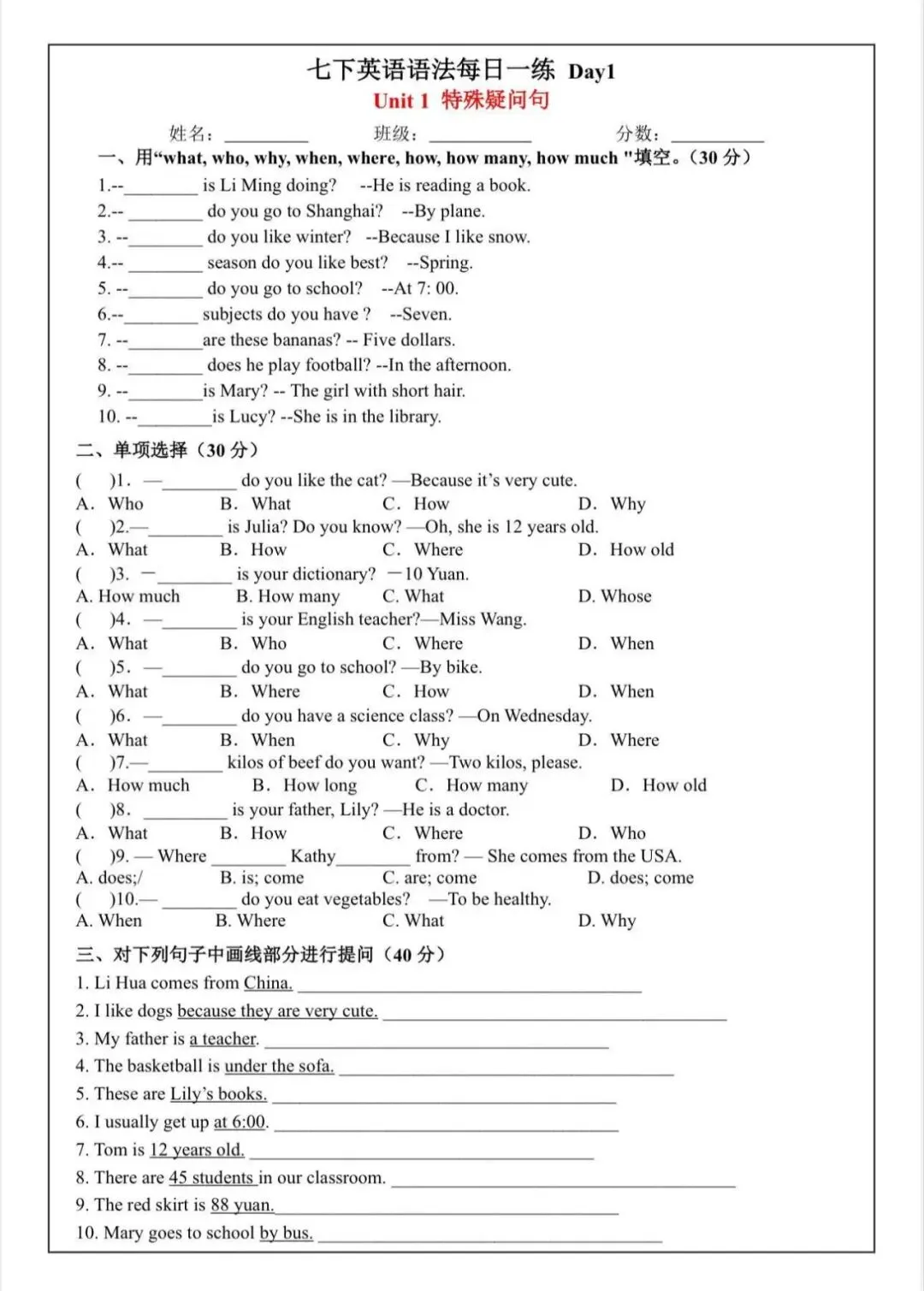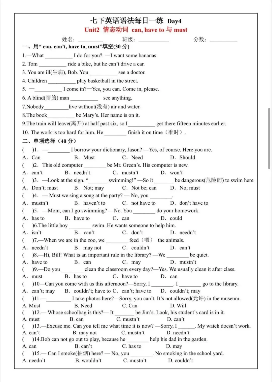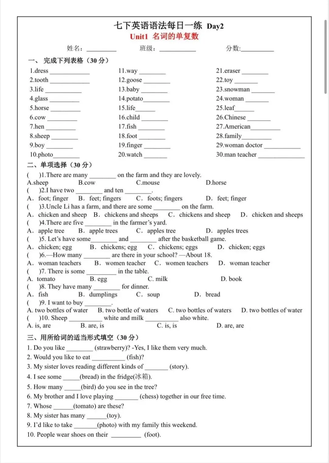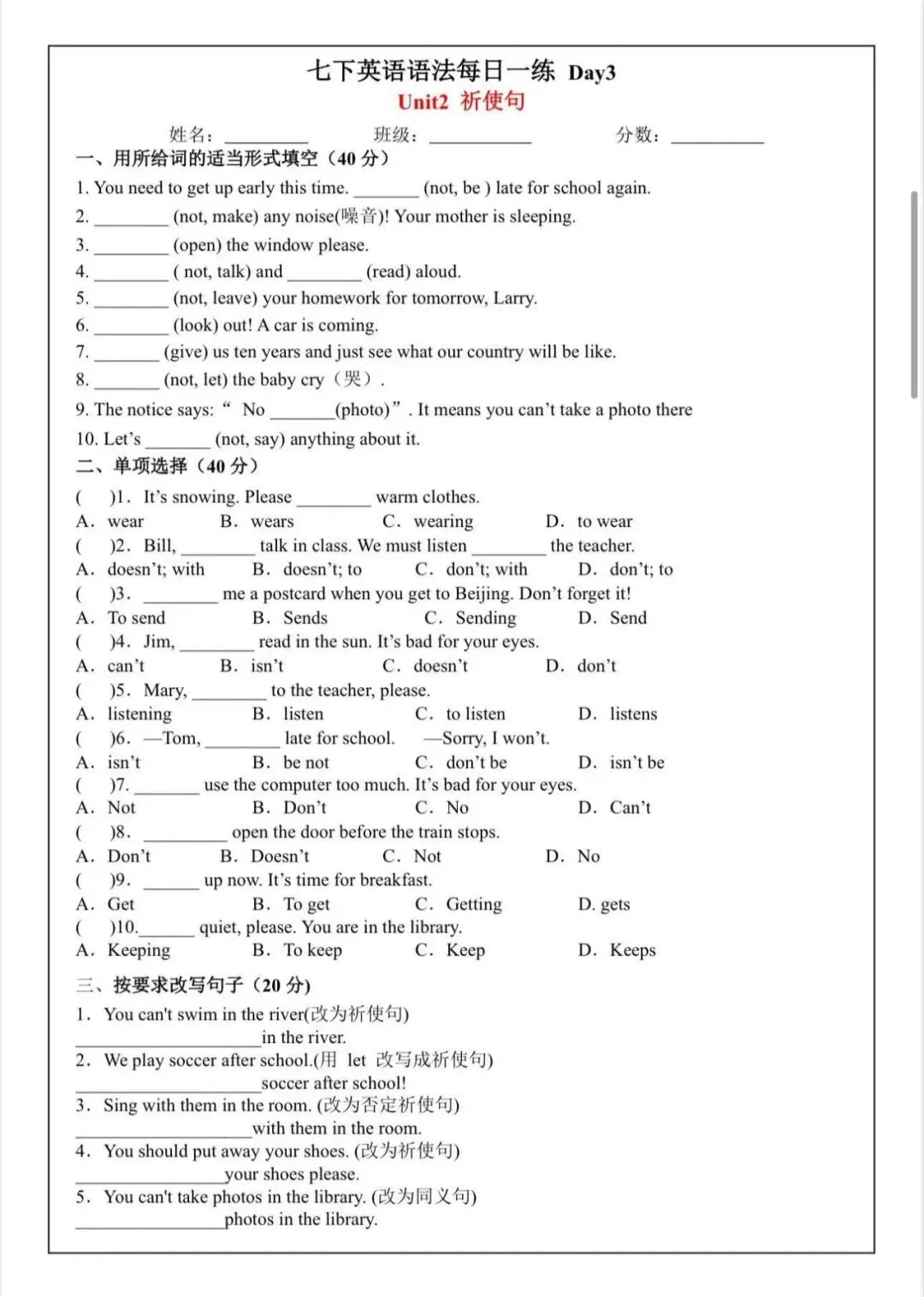 2026七下英语语法每日一练,可打印版