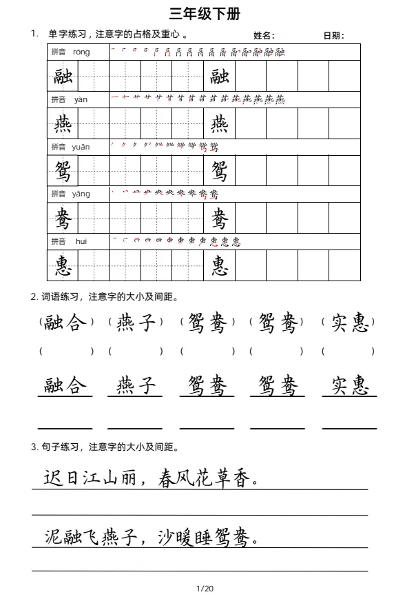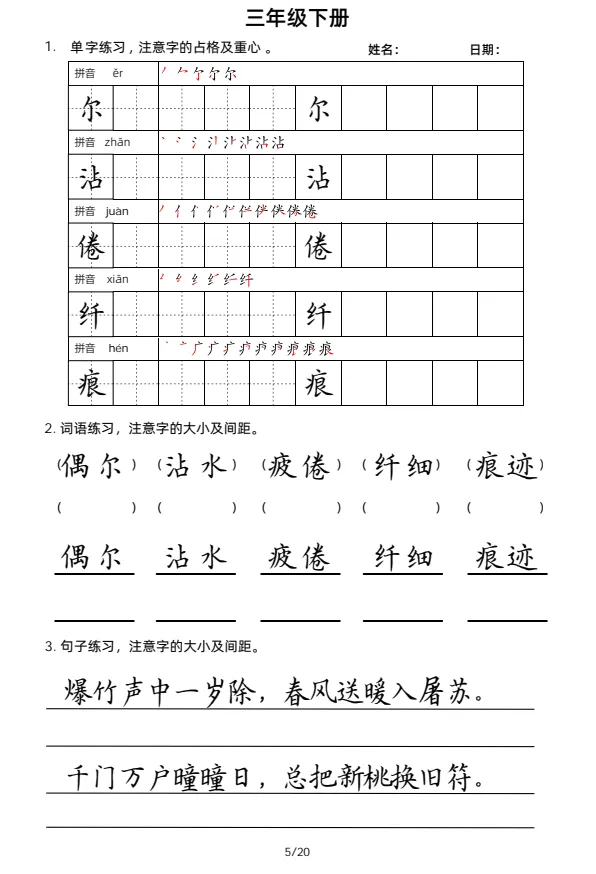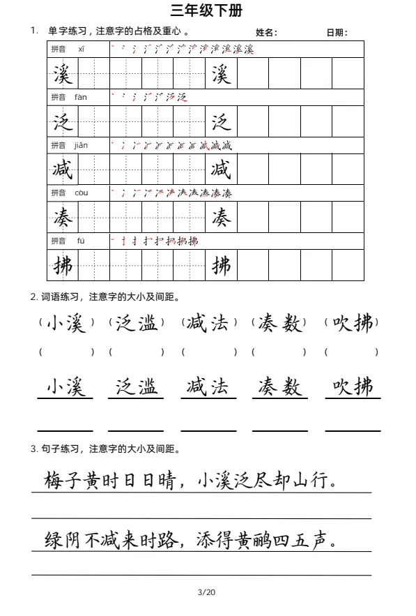 大家好,今天欣妈给大家分享的是:2026年春三年级下册语文《字词句每日小练笔》字帖,有生字练习,词语练习,句子练习;一二三四五六年级同款,电子版可下载可打印,拉至文末左下角,阅读原文处,完整电子版文章末尾可直接领取,无套路,欢迎收藏和下载。如果觉得这份资料不错,建议分享到班级群/年级群,让其他家长打印出来,帮助孩子学习;如果觉得合适,请支持正版!