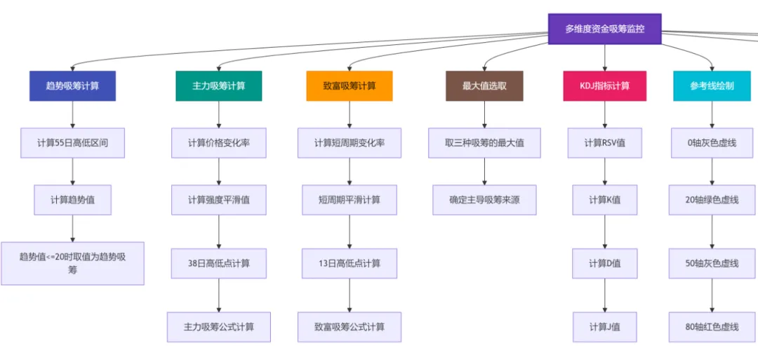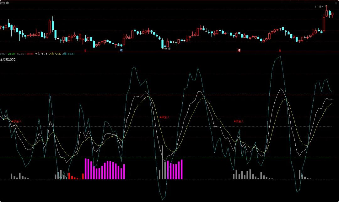 DRAWTEXT(最大吸筹>0 AND REF(最大吸筹,1)=0, 最大吸筹+50, ‘★资金入’), COLORRED;