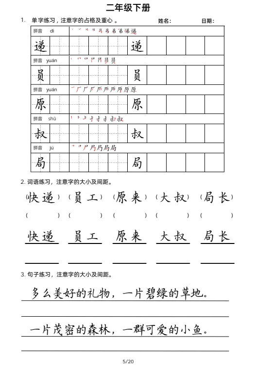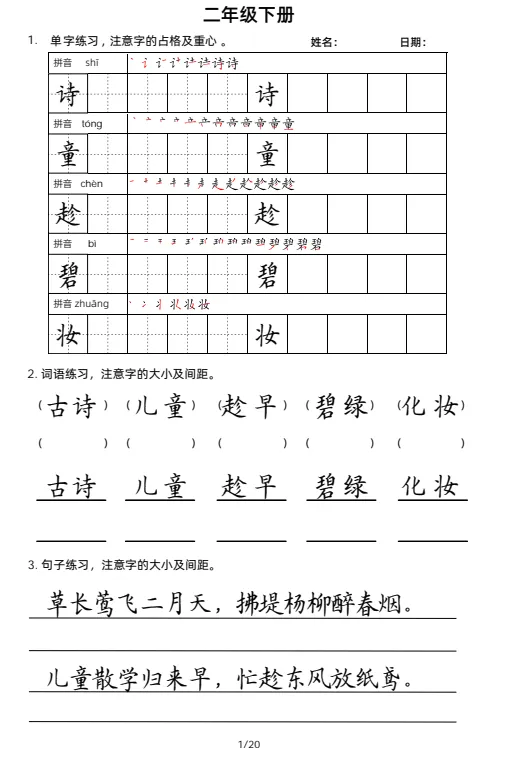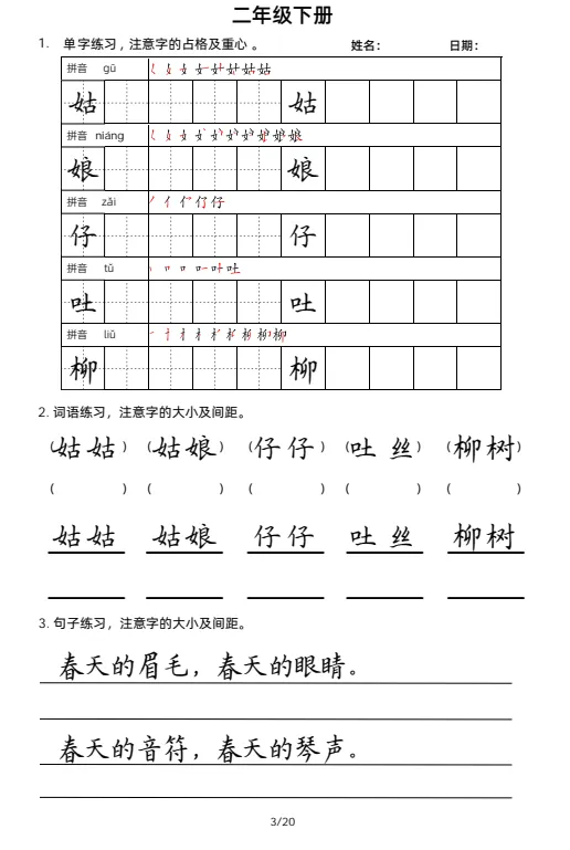大家好,今天欣妈给大家分享的是:2026年春二年级下册语文《字词句每日小练笔》字帖,有生字练习,词语练习,句子练习;一二三四五六年级同款,电子版可下载可打印,拉至文末左下角,阅读原文处,完整电子版文章末尾可直接领取,无套路,欢迎收藏和下载。如果觉得这份资料不错,建议分享到班级群/年级群,让其他家长打印出来,帮助孩子学习;如果觉得合适,请支持正版!
