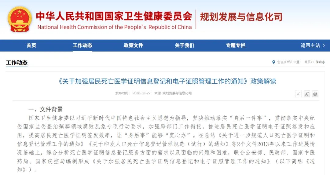 2月27日,国家卫生健康委网站发布由国家卫生健康委联合公安部、民政部、国家中医药局、国家疾控局联合印发的《关于加强居民死亡医学证明信息登记和电子证照管理工作的通知》(以下简称《通知》)。其中明确,自2026年7月1日起,医疗卫生机构使用全国统一制定的《居民死亡医学证明》。