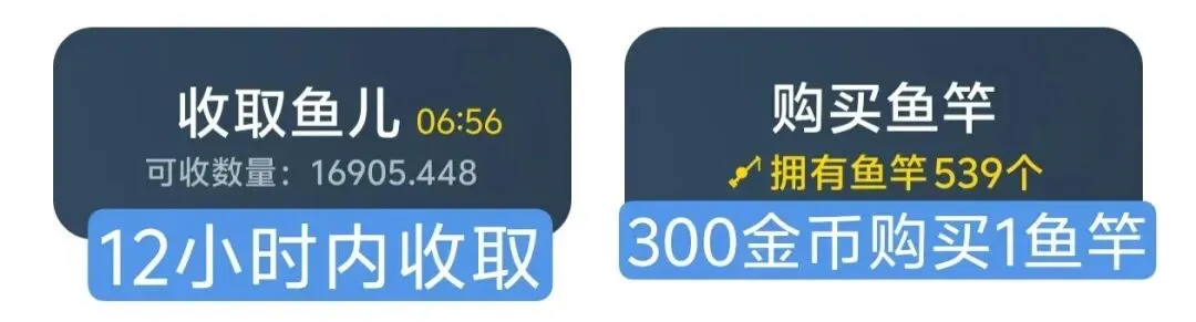 自动产鱼:鱼竿可全自动挂机产出鱼儿,收益最长可累计 12 小时,超时将停止累计,请及时领取收益